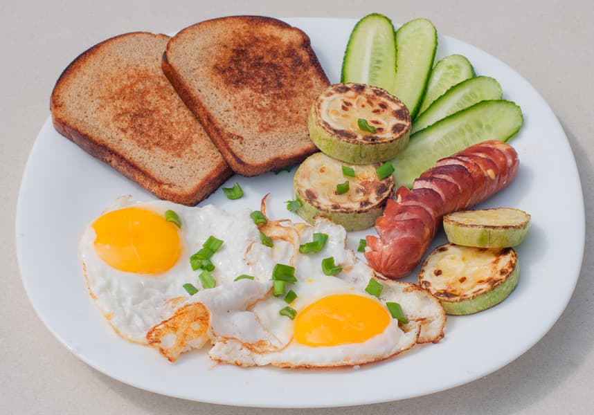 Мы взяли большую сковородку с плоским дном и выложили на нее кабачки, хлеб, сосиску. Обжарили на максимальной мощности в течение 3 минут, добавили яйца. За 5 минут получили полноценный завтрак.