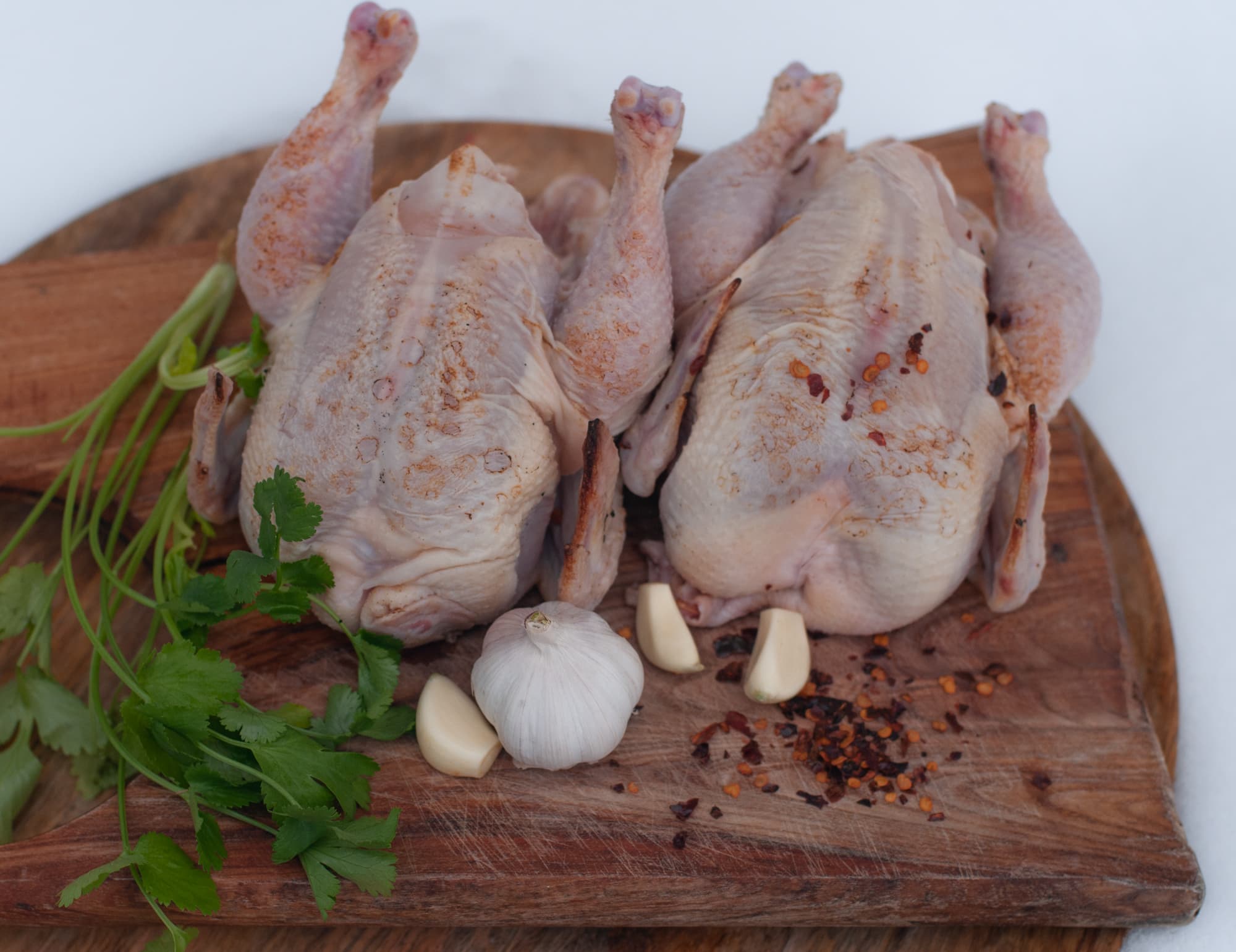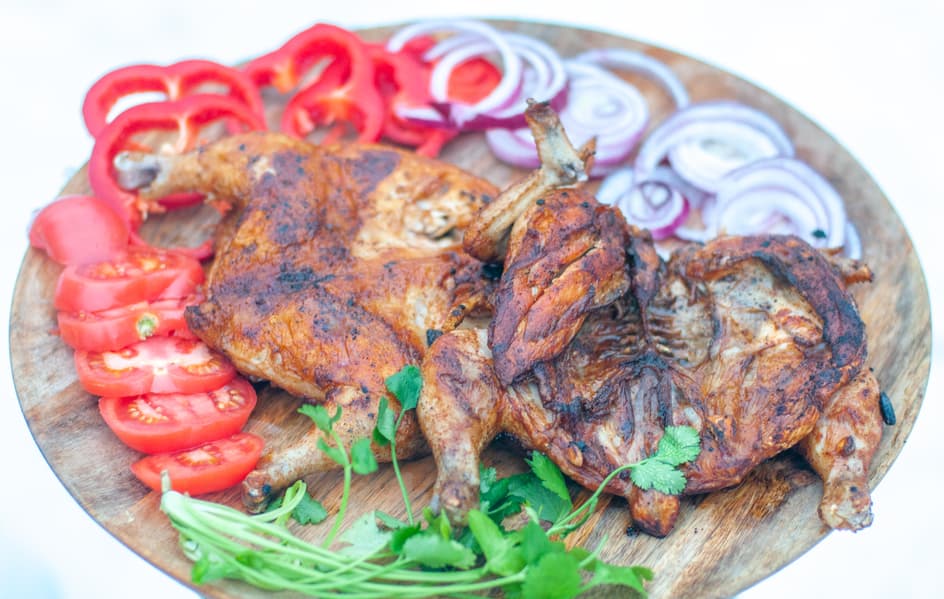 Для цыплят табака взяли корнишонов, натерли специями, распластали, зажарили под гнетом на большой сковородке на высокой мощности в течение 10-15 минут. После довели до полной готовности на средней мощности.