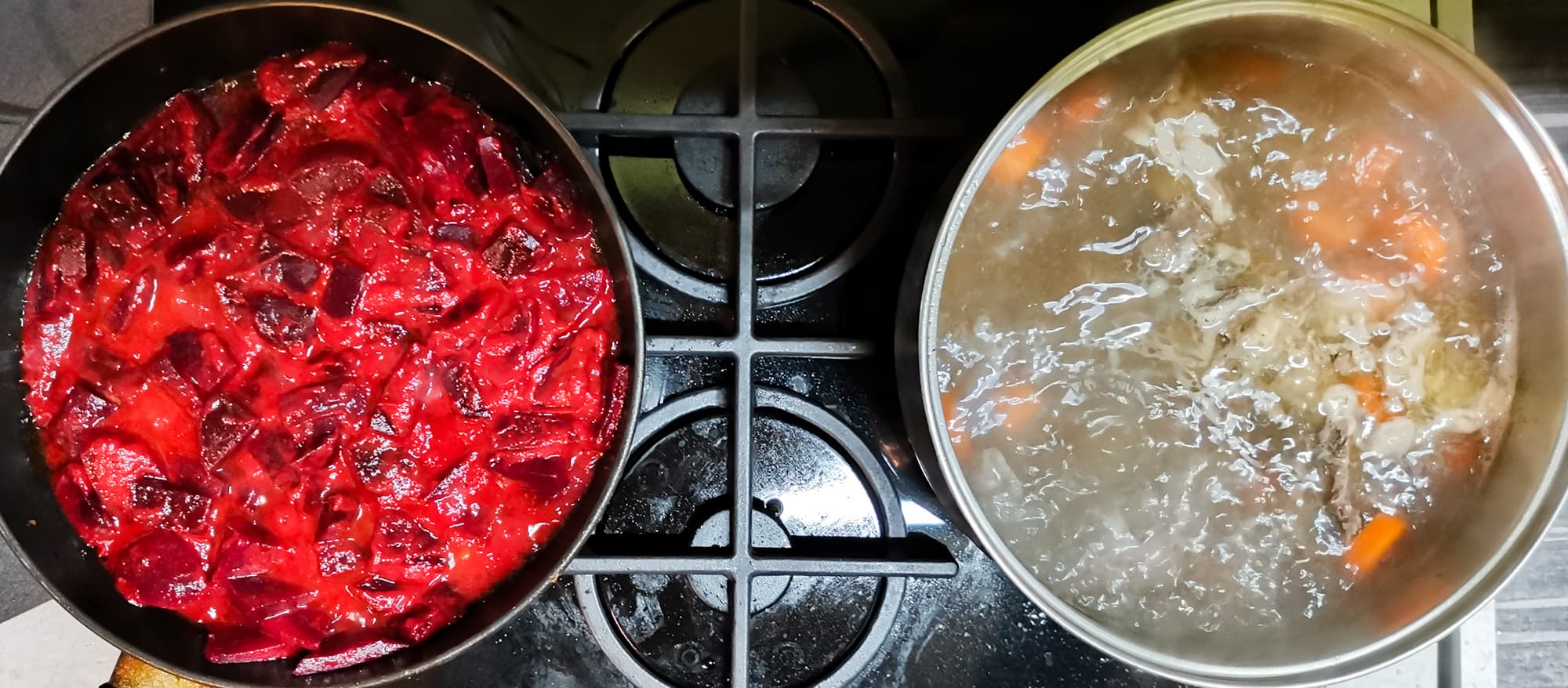 Держали на плите на минимальном огне бульон и на среднем свеклу до готовности.