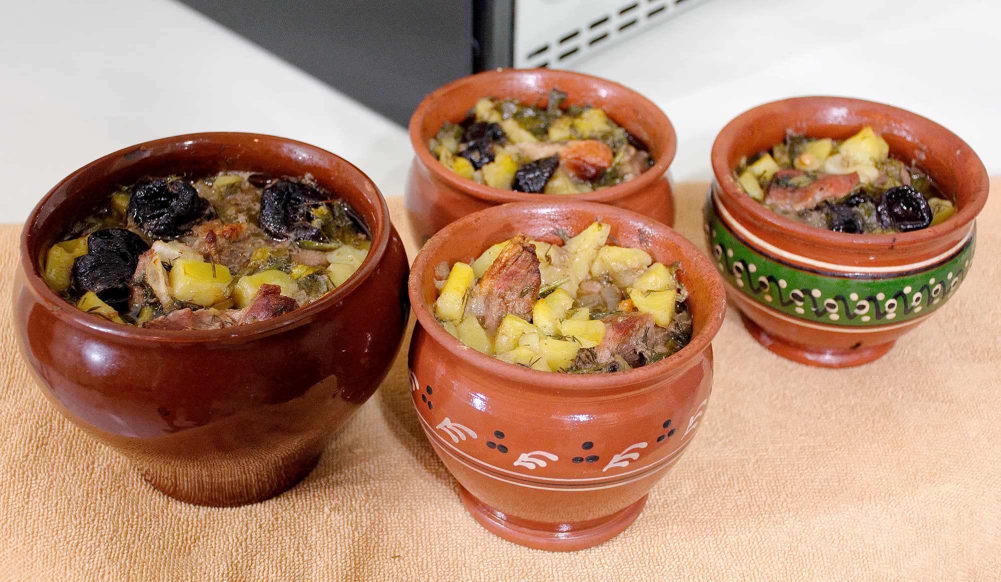 Продолжаем экспериментировать. Мы взяли для каждого горшочка примерно такой набор продуктов, как на фото: филе утиной грудки и бедра индейки, немного лука и морковки, немного картошки, зелень, пару зубчиков чеснока и несколько черносливин. Картошку для ускорения процесса сначала на три минуты поместили в микроволновку.