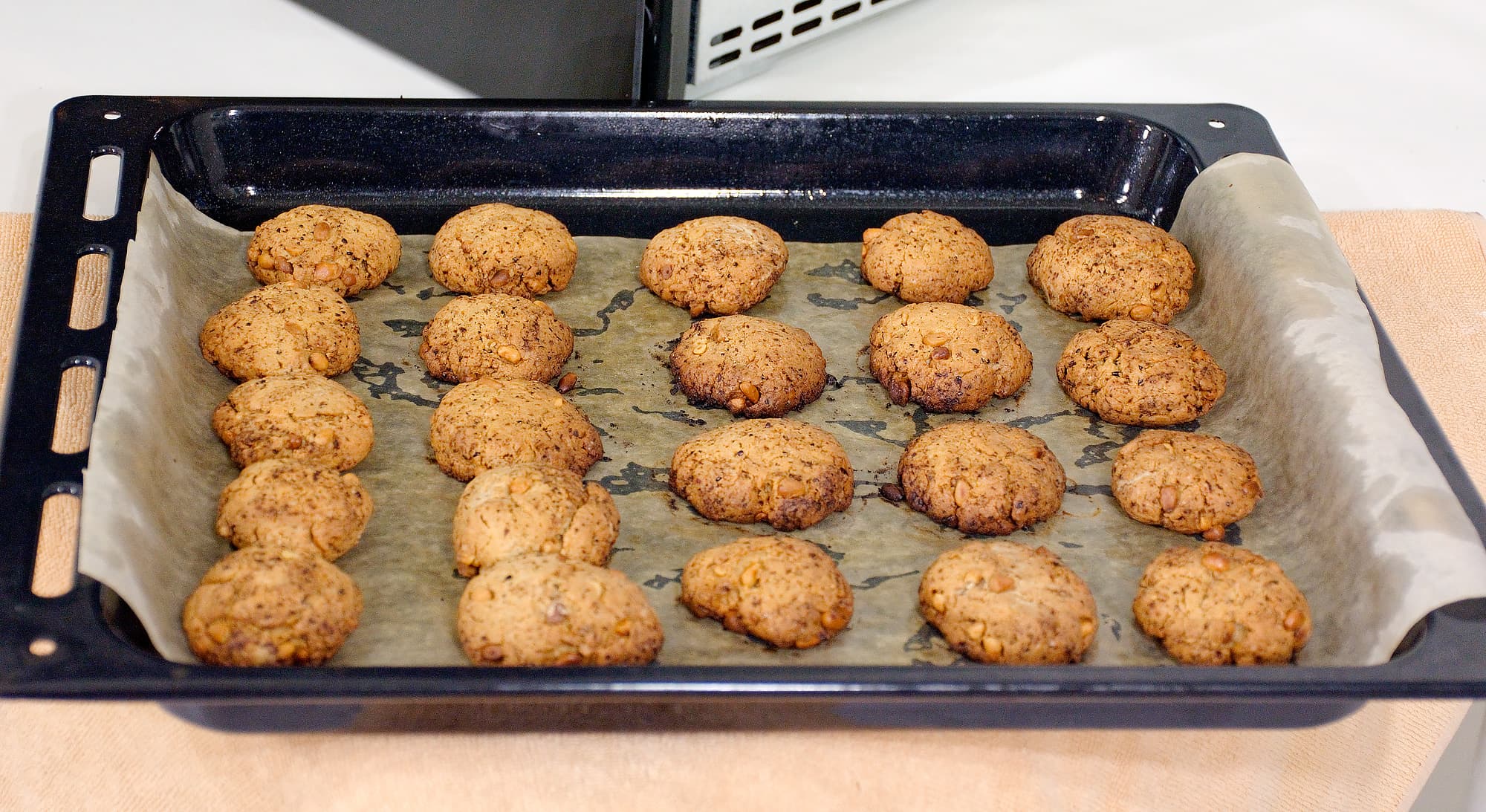 Затем вручную скатали кусочки теста в шарики, а те приплющили и разложили по противню. Бумага для выпечки попалась незнакомого сорта, поэтому ее предварительно смазали маслом.