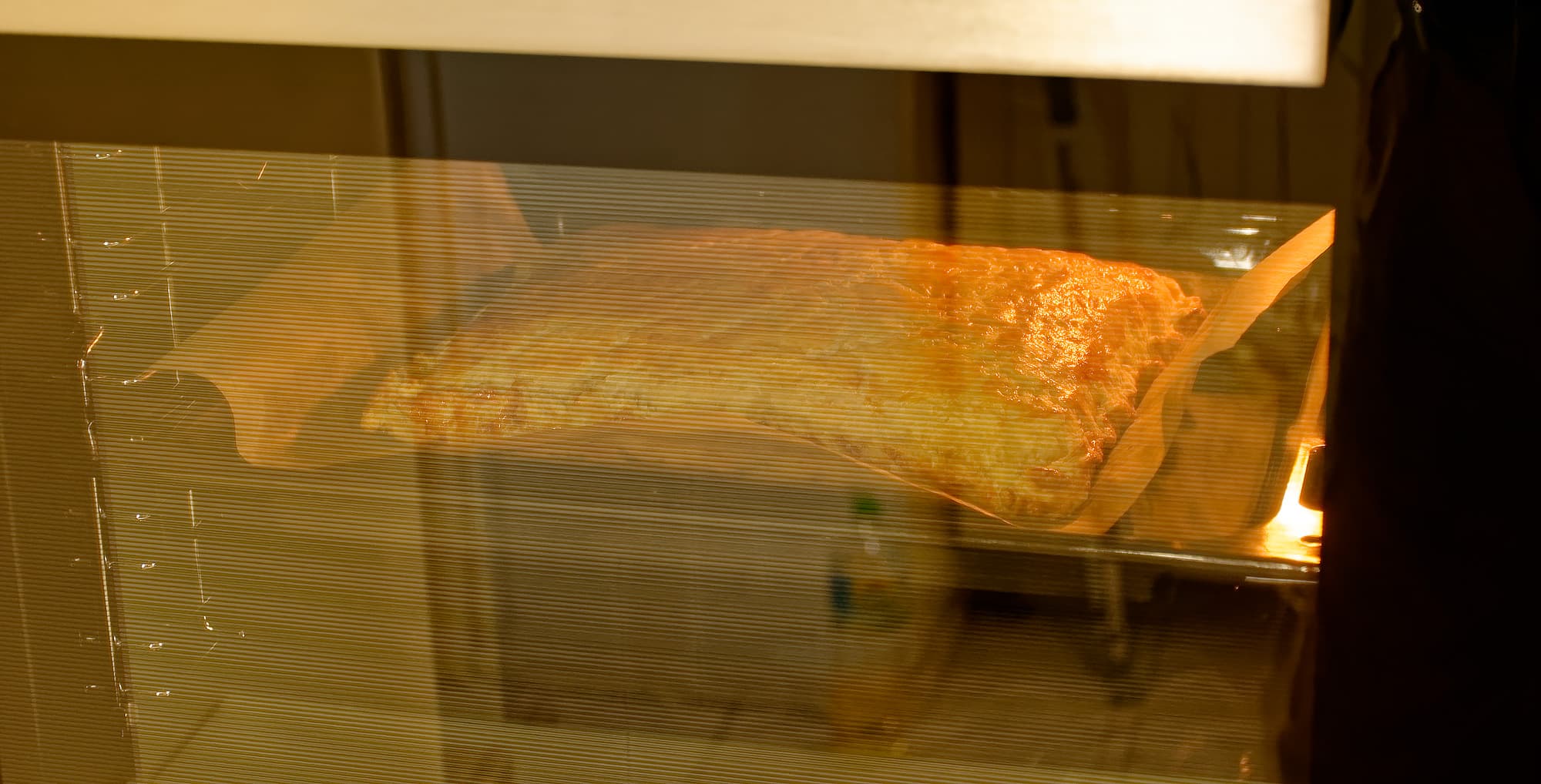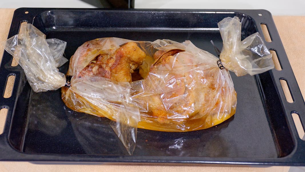 Сложили полученное в пакет для запекания и защепили края прилагающимися к пакету клипсами. Выставили режим верхнего и нижнего нагрева и температуру на значение 175 (на самом деле, как теперь уже мы знаем, она будет выше номинала). Пакет прокололи в нескольких местах, чтобы выходил горячий воздух, и поместили в нашу тестируемую.