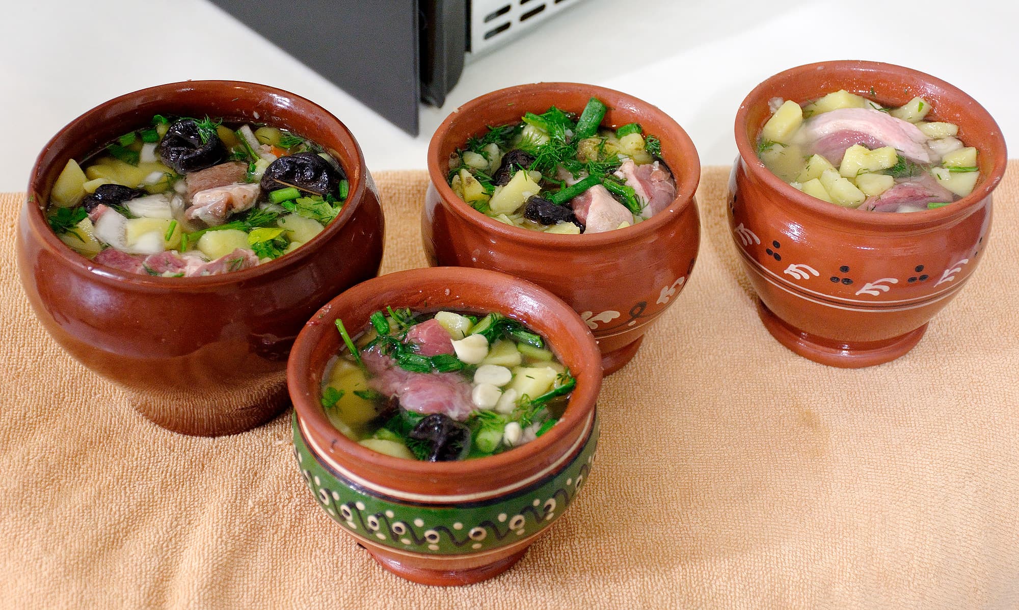 Ингредиенты разложили по разномастным горшкам, добавили соли, перца и немного воды.