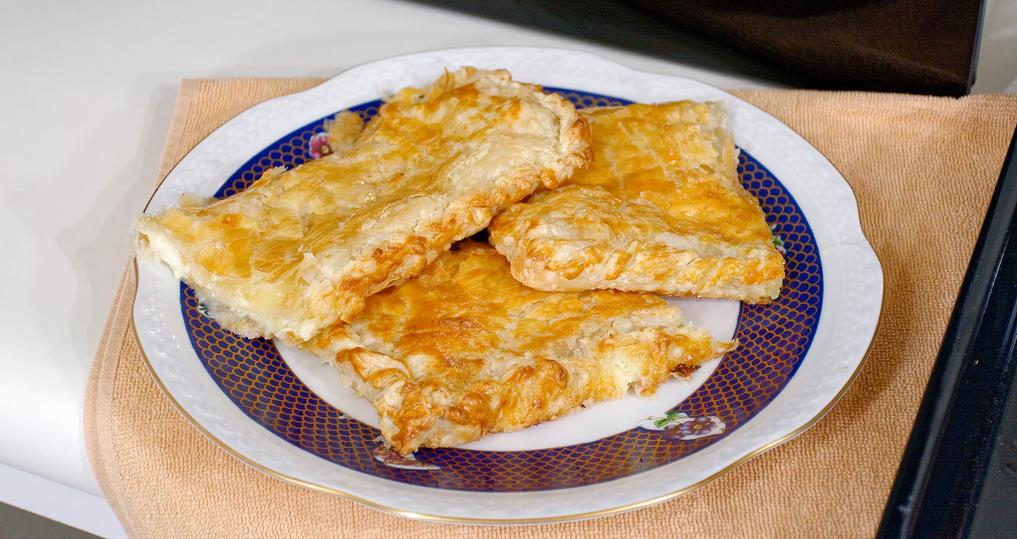 Начали мы с «ленивого» пирога из готового слоеного теста. Стандартный пласт размороженного теста растянули руками в прямоугольник, натерли на крупной терке примерно 400 граммов моцареллы, которую немного посолили и смешали с парой зубчиков чеснока. Сверху на сырную начинку натерли немного сливочного масла.