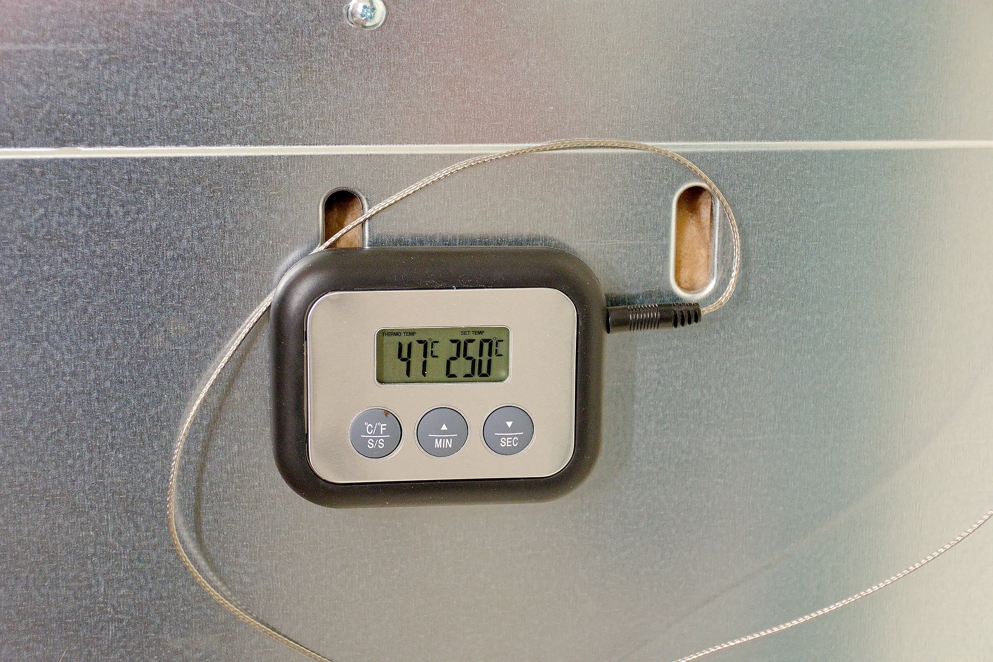 Несколько насторожило даже не несоответствие температуры заявленной величине, а разброс между нижним и верхним значением. Для перепроверки мы выставили левой ручкой температуру 150 °C и замерили фактические значения в центре противня. Увы, результат примерно соответствует предыдущему: термощуп намерил диапазон от 149 до 200 °C.
