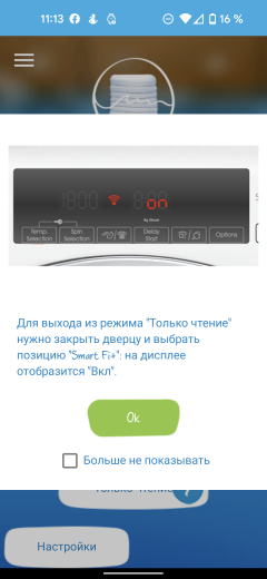 Сетевые функции работают в любом положении селектора, но начать стирку через приложение можно только когда он установлен на отметку «Wi-Fi».