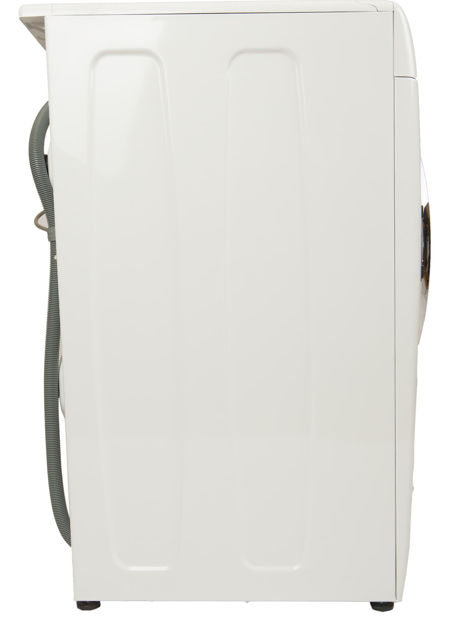 На боковых стенках стиральной машины есть выштамповка, усиливающая жесткость панелей. При взгляде сбоку видно, что окантовка люка слегка, приблизительно на 25 мм, выступает за габарит: это следует учитывать, если на пути к месту установки поджидают узкие дверные проемы.