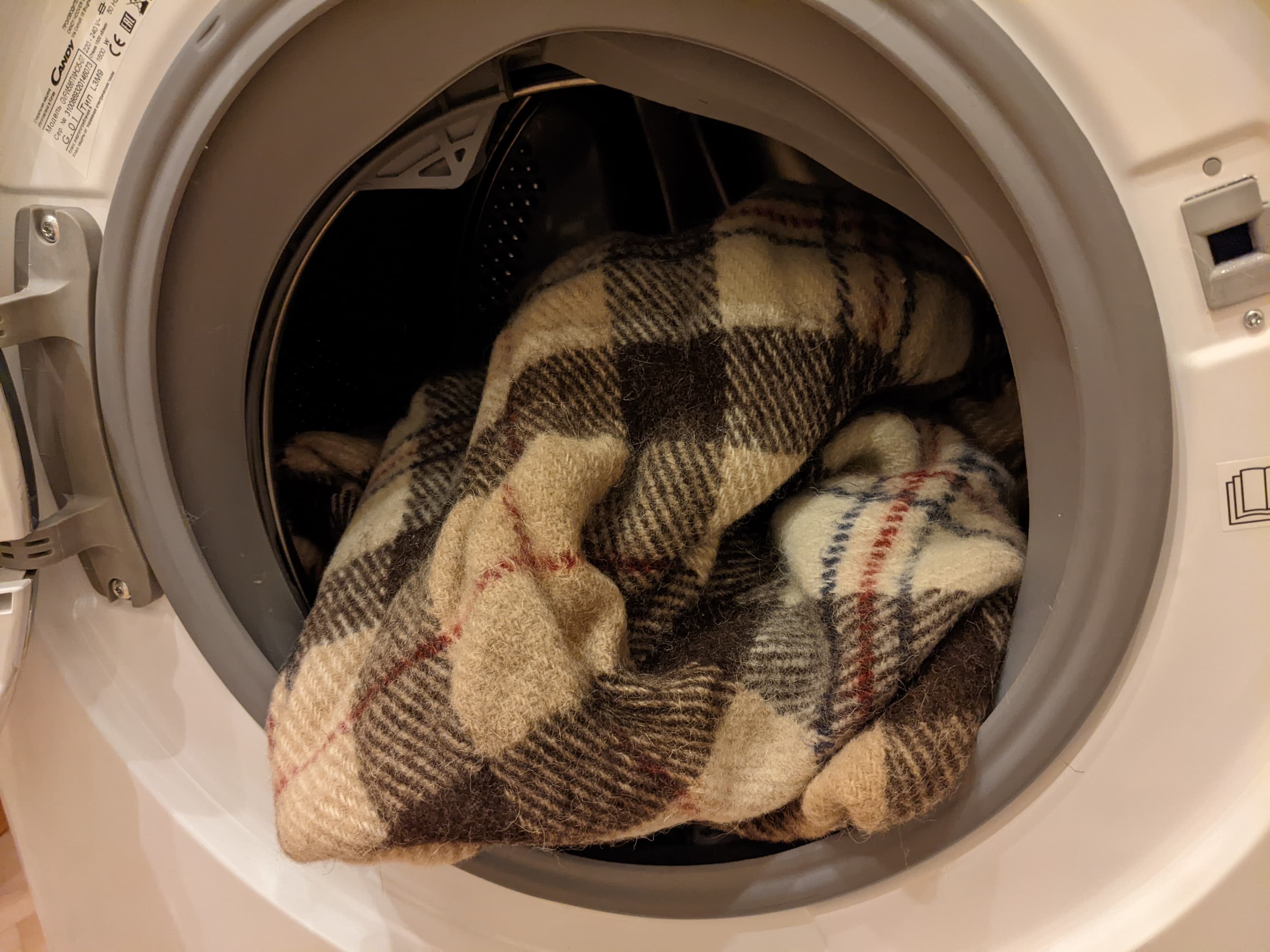 Машина качественно и бережно обошлась с нежным изделием, предназначенным, согласно этикетке, только для ручной стирки. Шерсть в процессе стирки не свалялась, а все следы эксплуатации с ткани исчезли — выглядит плед безукоризненно.