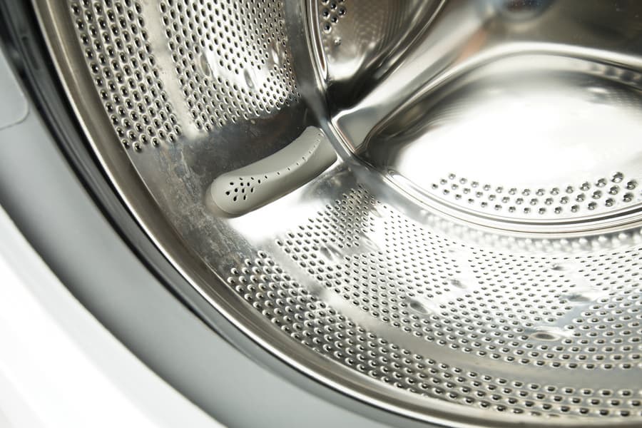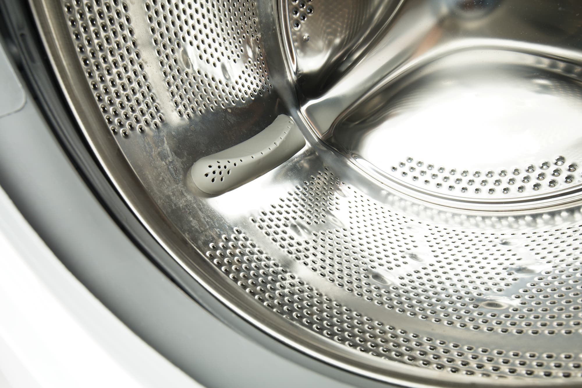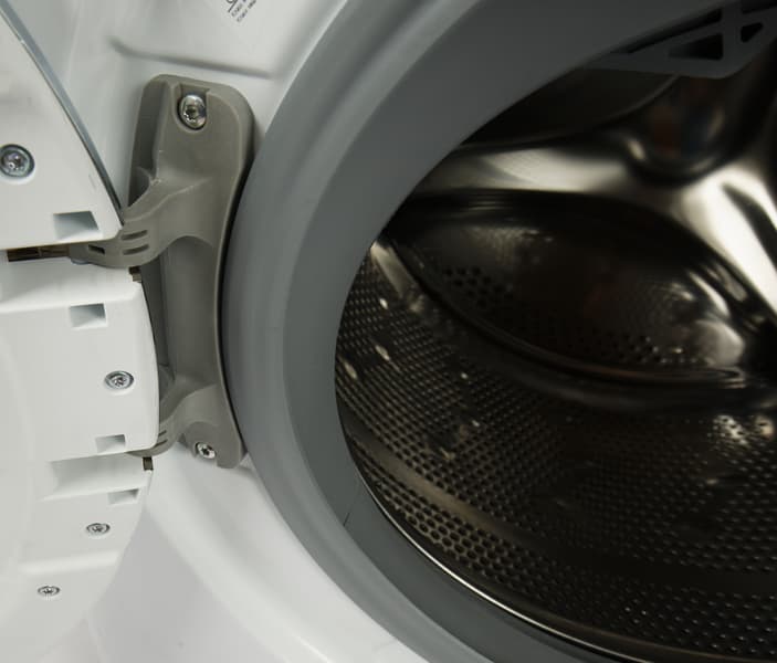 В барабане из нержавеющей стали перфорация нанесена как на торцевую стенку, так и по периметру. На стенках также выделяются круглые выступы, расположенные группами по три: вероятно, они призваны как-то улучшить гидродинамику. Серые пластиковые бойники с перфорацией слегка изогнуты — они способствуют перемешиванию белья.