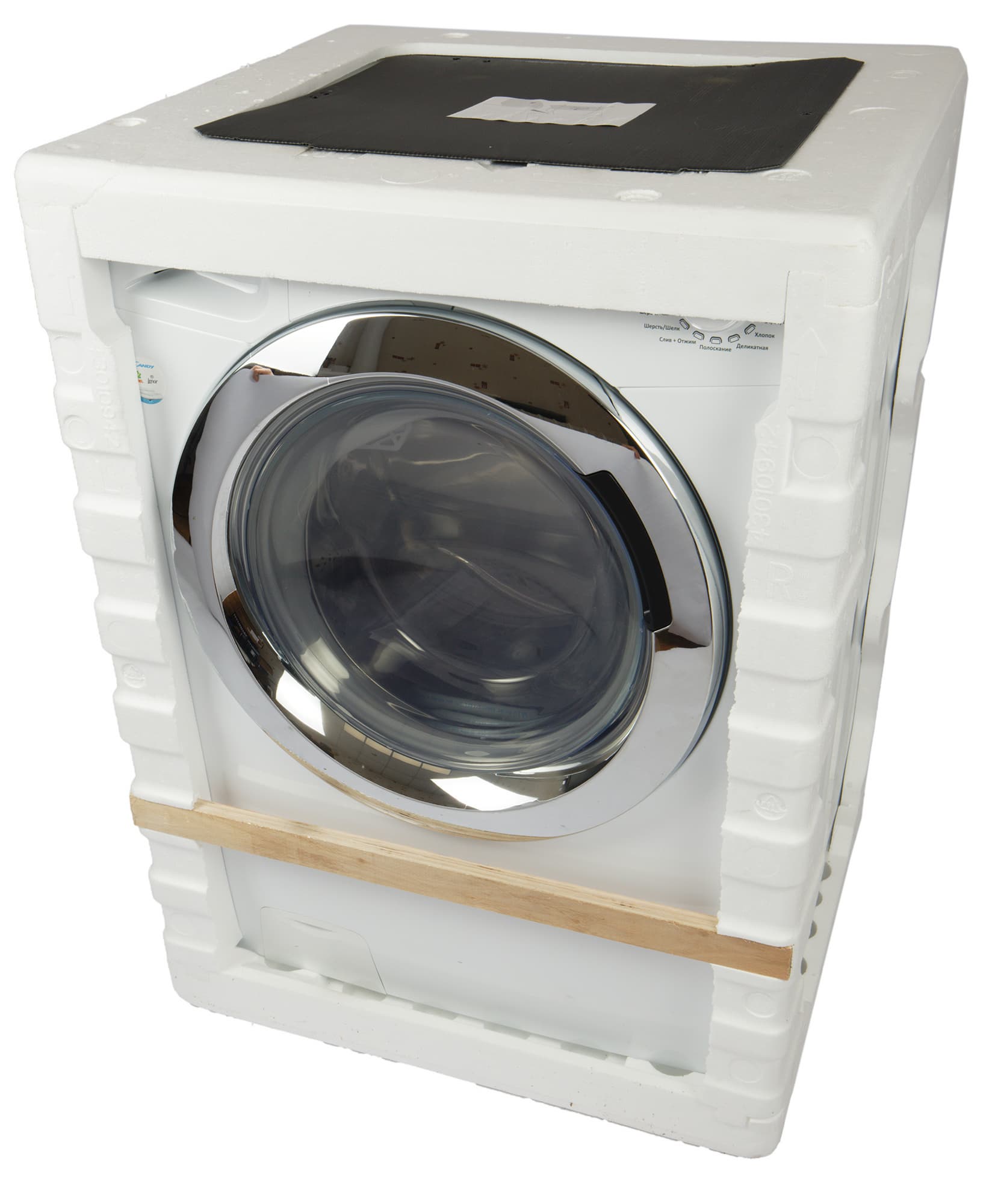 Стиральная машина поставляется в технологической упаковке из пенопласта, обтянутого полиэтиленовой пленкой. С лицевой стороны тара усилена деревянной планкой, защищающей люк барабана.