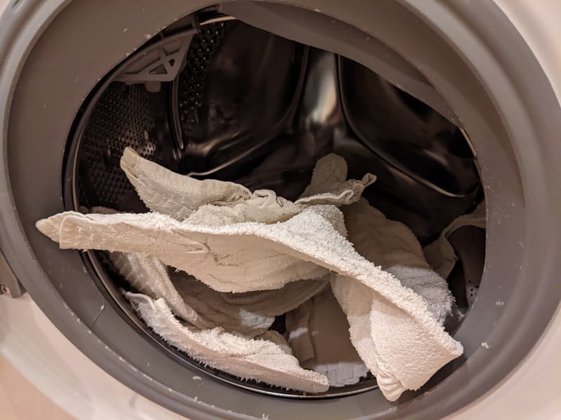 Разумеется, мы оценили и реальную эффективность отжима, которую измеряем в граммах воды на грамм хлопка по формуле: (вес отжатого − сухой вес) / сухой вес. В качестве эталонного белья использовались 10 махровых белых полотенец из Икеи общим весом около 1,8 кг.
