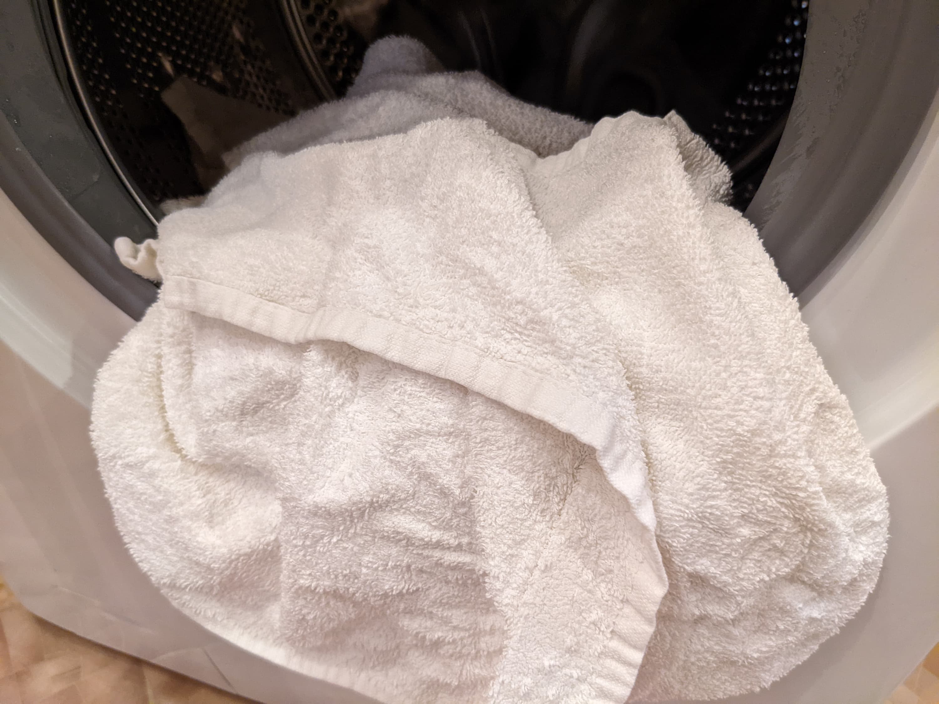 Умышленно пересушив в ее же барабане комплект белых махровых полотенец до состояния «можно поставить в угол», мы расправили их, загрузили обратно в машину и воспользовались режимом «Легкая глажка».
