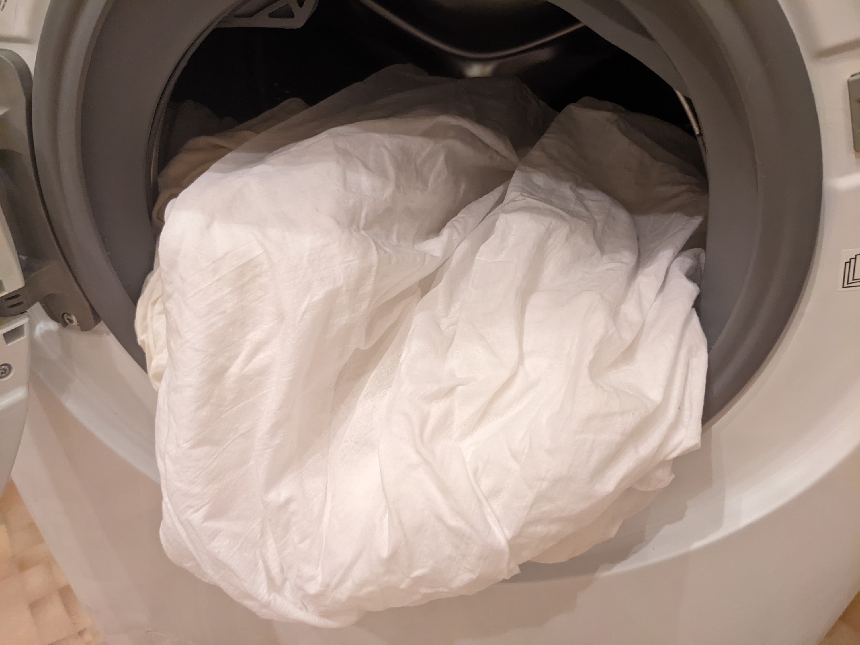 Оценить качество сушки хлопковых тканей мы решили на примере двуспального комплекта постельного белья (пододеяльник, натяжная простыня и две наволочки общим весом в 1904 г). Выстирали его и включили режим сушки хлопка на максимуме.