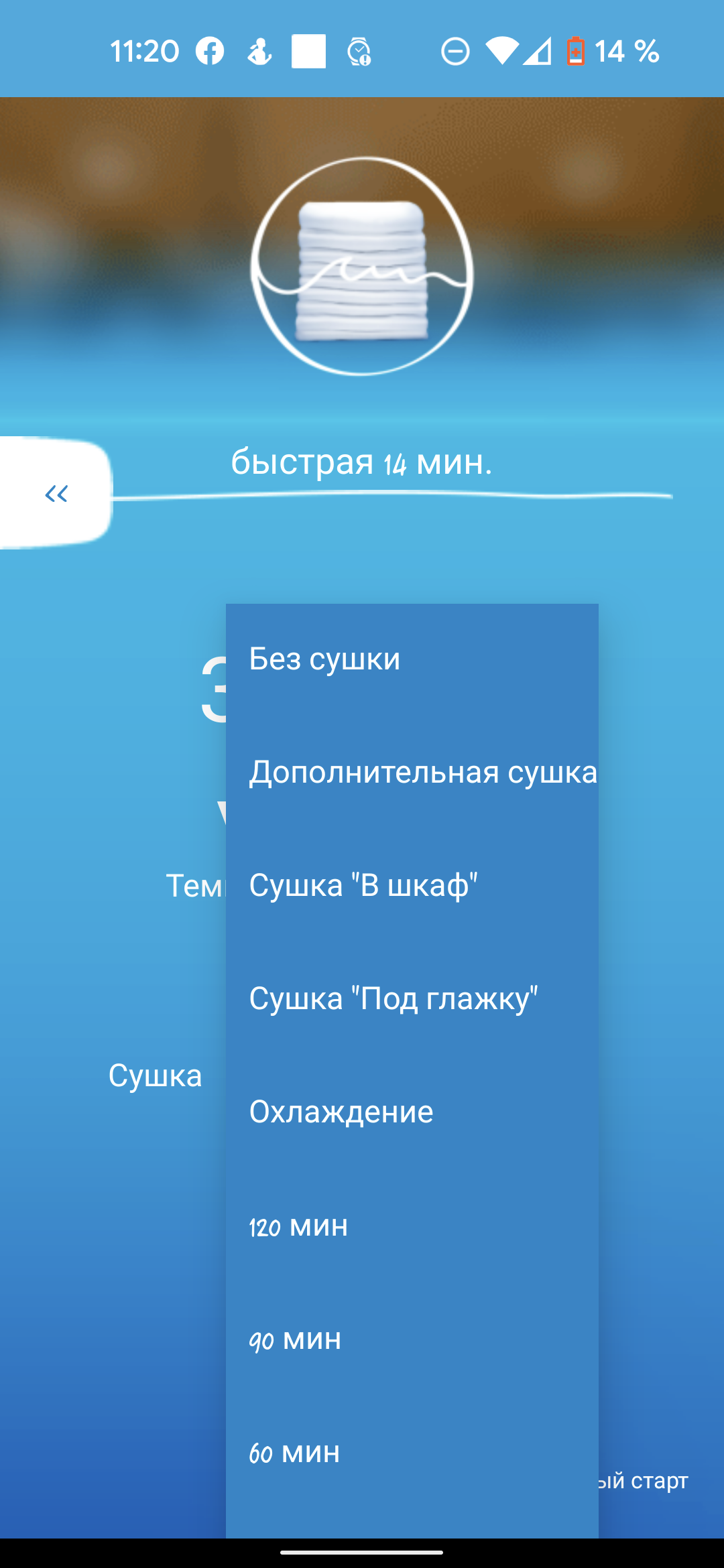 Выбор режимов сушки позволяет установить желаемую степень влажности белья (очень сухое, «под утюг», «на вешалку») или устанавливает время работы сушилки: доступны значения в 30, 60, 90 и 120 минут.