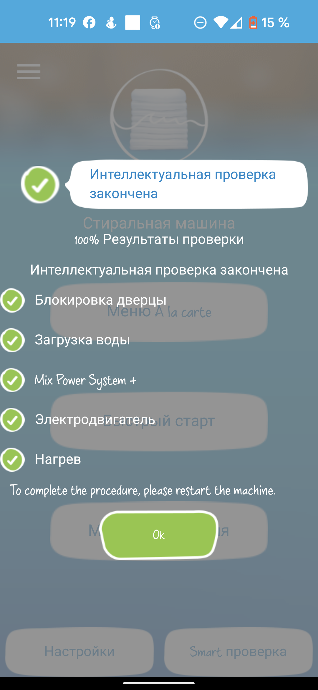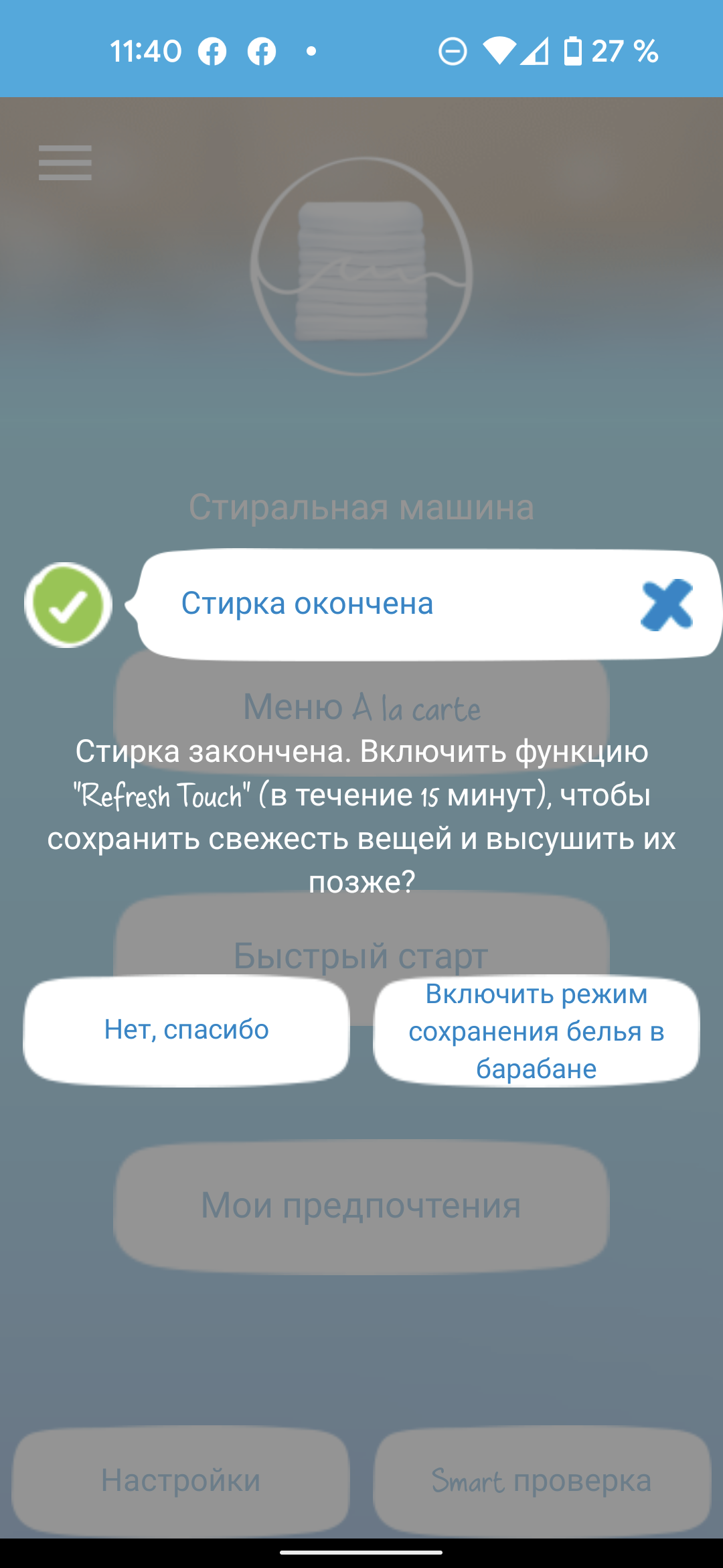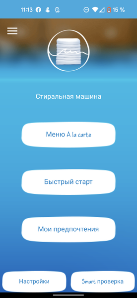 Конец финального отжима еще не значит, что можно будет достать белье сразу. Барабан остается заблокированным еще минуты на две — время отсчета начинается с момента остановки вращения и выключения помпы. Как только люк можно будет открыть, машина одновременно подаст сигнал голосом и отправит push на мобильник, к которому подключена. Причем пуш придет и если цикл запущен из приложения, и если установлен вручную.