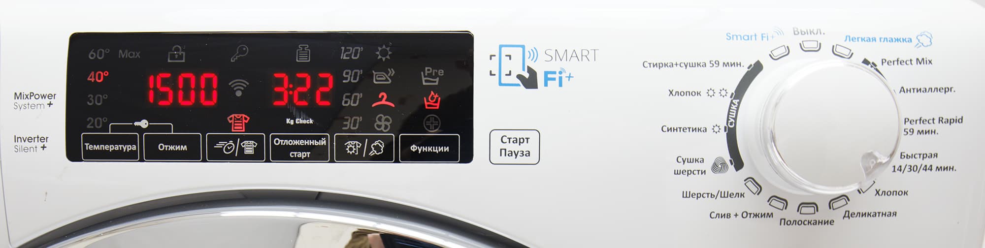 - Perfect Rapid 59 минут, специальный сценарий для быстрой стирки уменьшенного количества белья