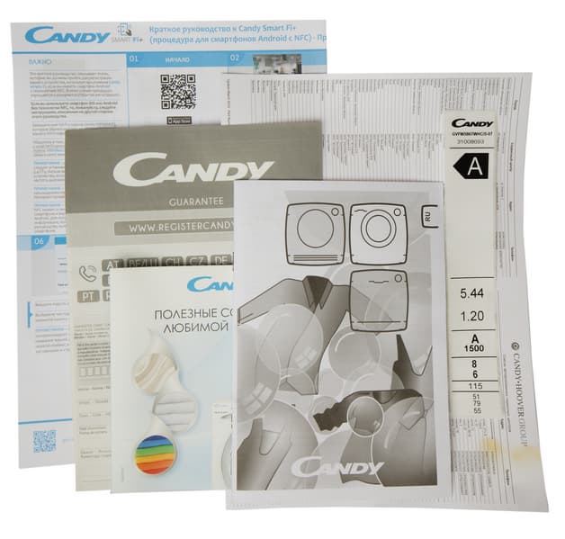 У Candy есть обыкновение делать одну инструкцию для нескольких моделей стирально-сушильных машин: на первой странице наклеен индекс нужной, а вместо таблицы программ вставлен лист с актуальными данными. Сведения о продавце и дате продажи вносятся в руководство на первой странице.