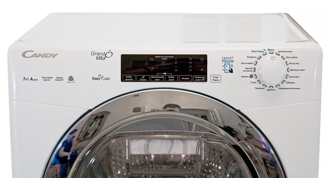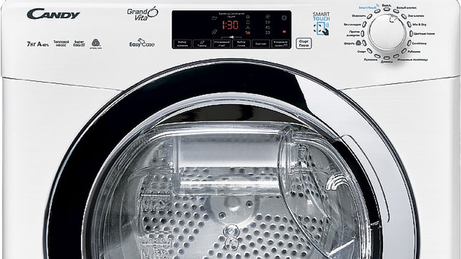 Основное удобство именно выделенной сушильной машины состоит в том, что это позволяет стирать и сушить за один раз действительно много белья. Мы исследовали Candy GVS4H7A1TCEX-07 в комбинации со стиральной машиной с 7-килограммовой загрузкой и убедились в том, что эта сушилка действительно способна высушить ровно столько, сколько стиралка смогла постирать. Напомним, что среднестатистические комбинированные стирально-сушильные машины, как правило, требуют при задействовании сушки ограничить загрузку двумя третями бака.