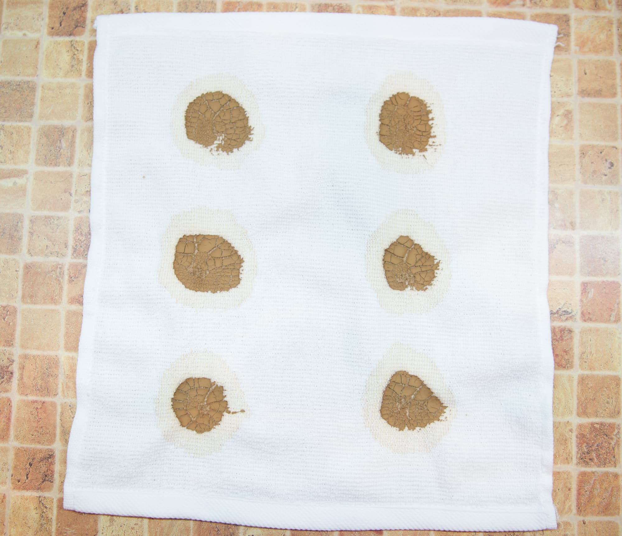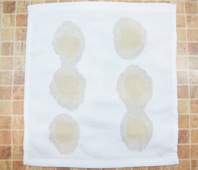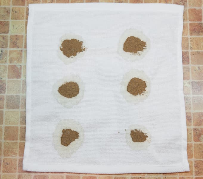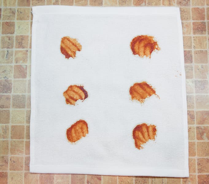 Мы запачкали белые хлопковые полотенца теми органическими веществами, которые часто встречаются и трудно отстирываются. На каждое полотенце попала своя грязь: красное вино, кетчуп, соевый соус и какао. Все это сохло при комнатной температуре в течение суток.