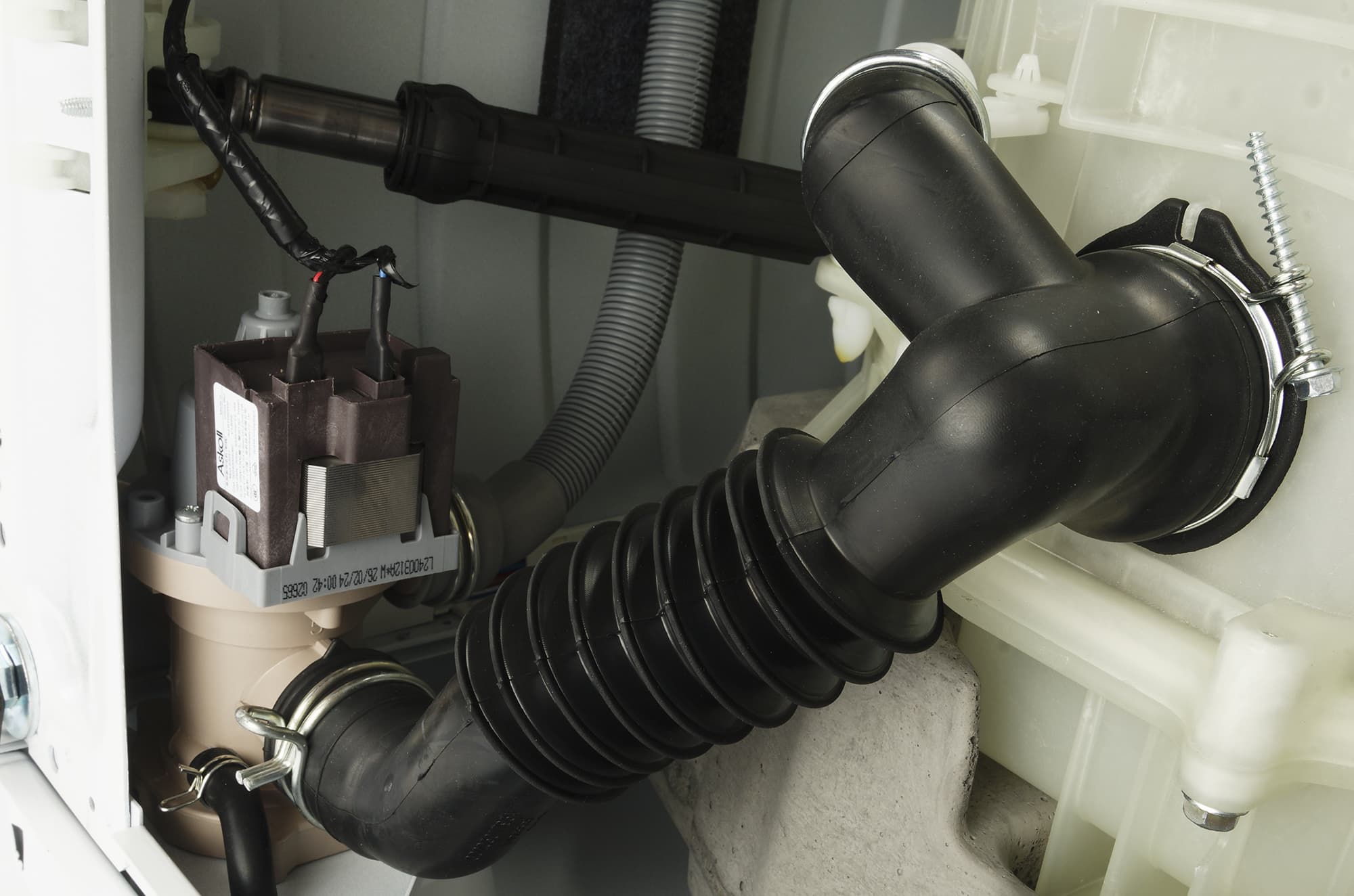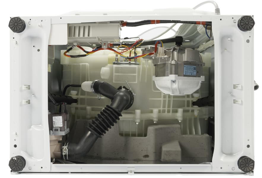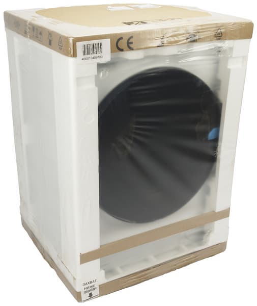 Вскрыв упаковку, внутри мы обнаружили саму машину с установленным сливным шлангом, простой заливной шланг (без специальных приспособлений, контролирующих отсутствие протечек), кронштейн для монтажа шланга, заглушки для установки на место транспортировочных болтов, антишумовой поролон, руководство пользователя и обязательную наклейку с информацией об энергетической эффективности.