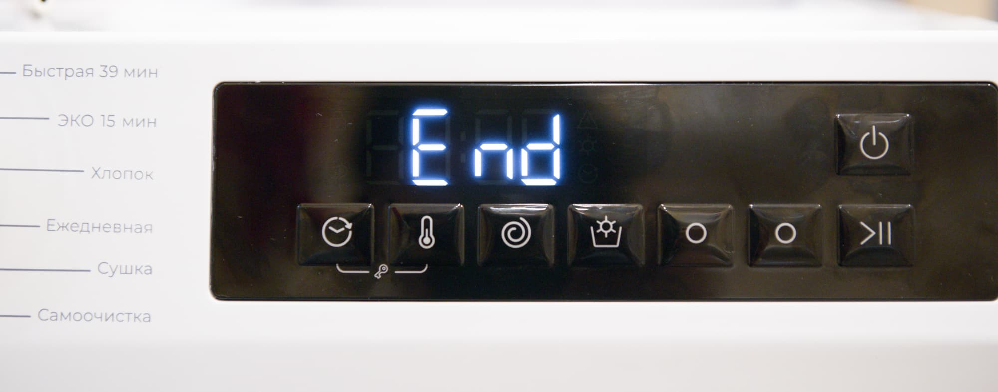 До запуска на дисплее крупными яркими цифрами отображается расчетное время выполнения программы, после — время, оставшееся до завершения. По окончании появляется надпись End.