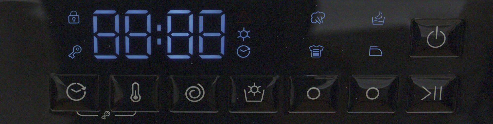 Панель управления с мембранными кнопками и цифровым дисплеем, расположенная в правой части, в первую очередь включает машину, а затем, после выбора программы селектором, дает возможность активировать дополнительные опции.