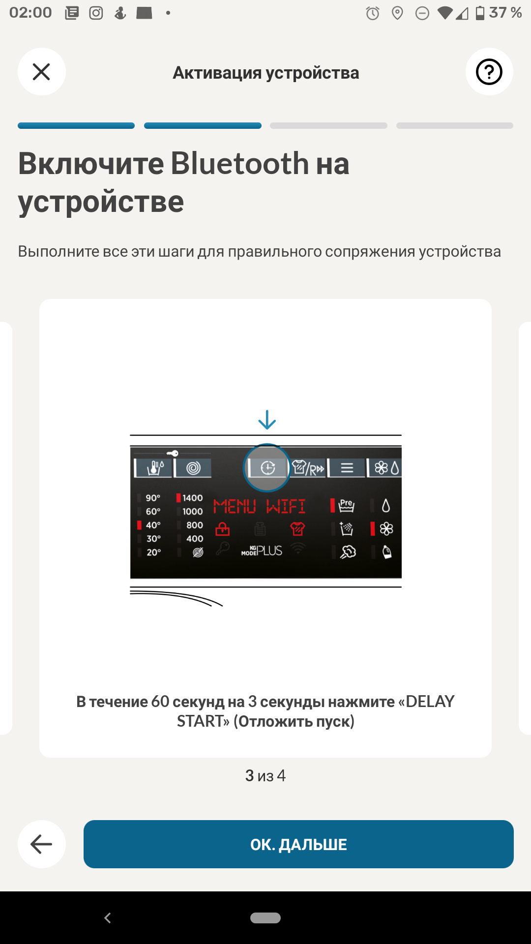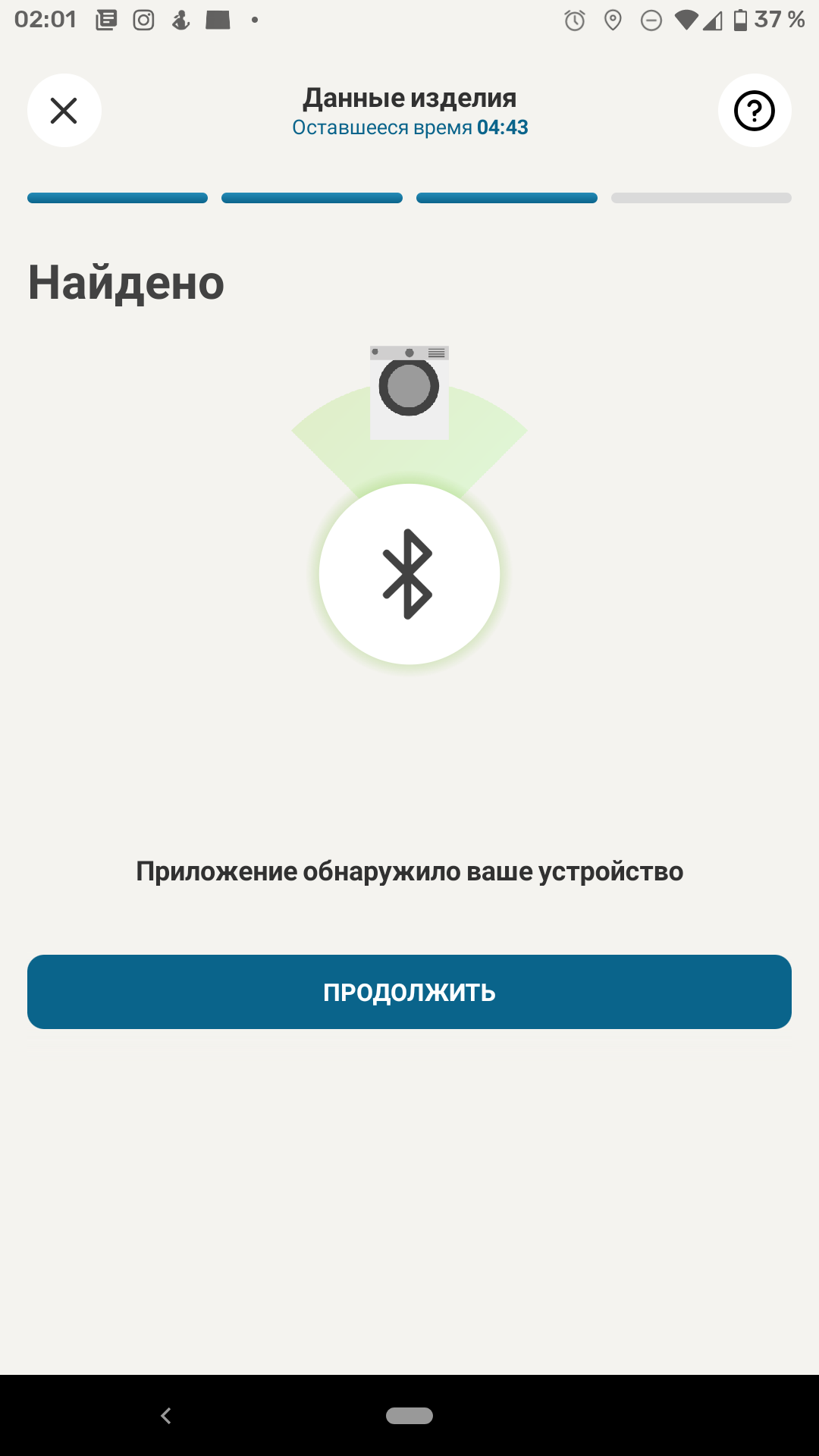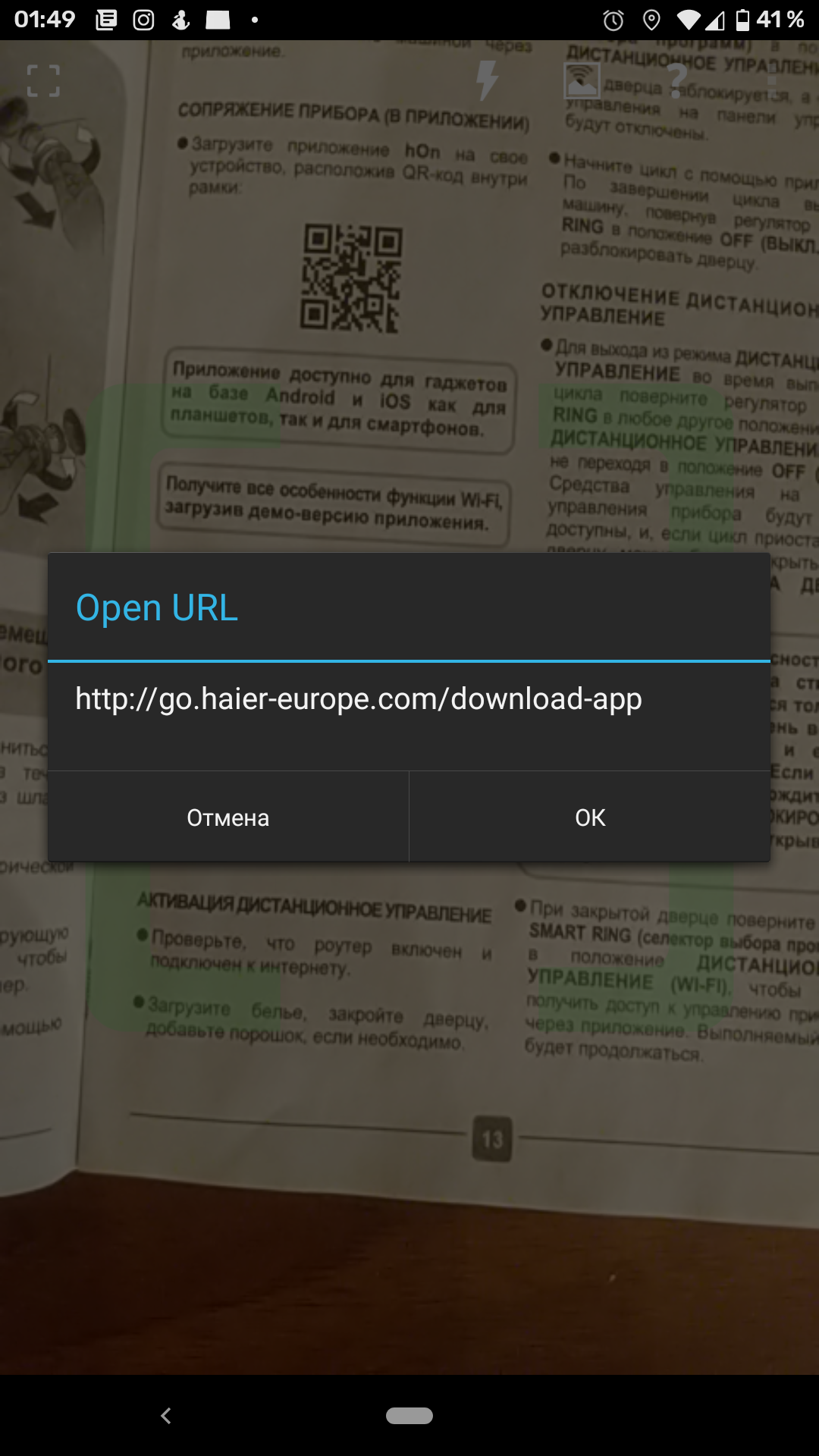 Для синхронизации машины необходимо просканировать QR-код, расположенный на наклейке с серийным номером под люком барабана. Приложение подсказывает, где его искать, и запрашивает разрешение на доступ к камере.