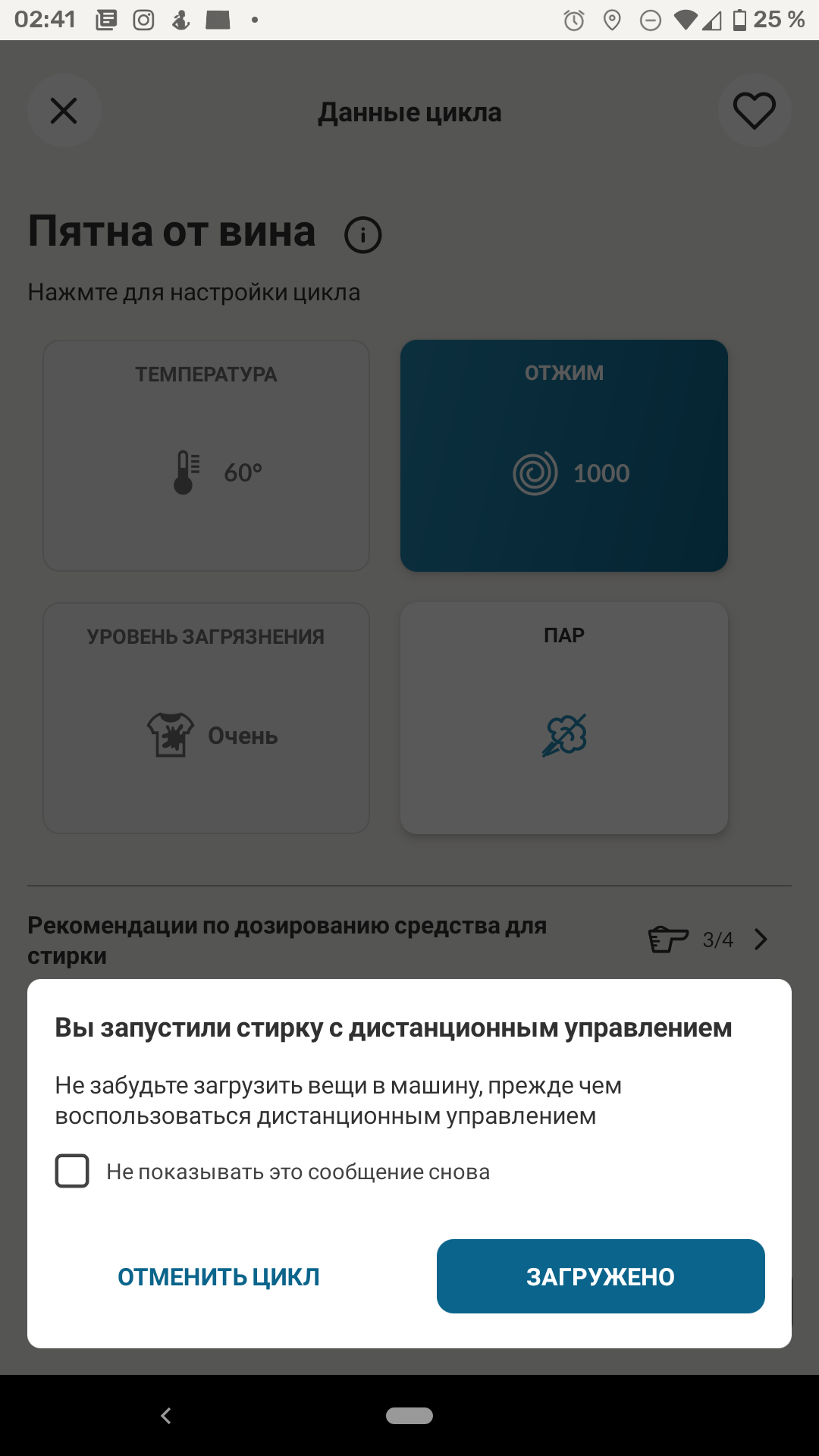 Конечно, главное, для чего стиральной машине требуется мобильное приложение — это возможность запустить с его помощью выбранный цикл. После загрузки барабана hOn оценивает время работы программы и — в первый раз это было очень неожиданным — сообщает прогноз погоды к ожидаемому окончанию (вот для чего нужно было определение местоположения). Поразмыслив, мы поняли, что эта функция может оказаться полезной для тех, кто сушит белье на открытом воздухе или балконе: любителям проветривать белье на улице полезно знать о приближающемся дожде. Для всех остальных проверку прогноза можно отключить в настройках приложения.