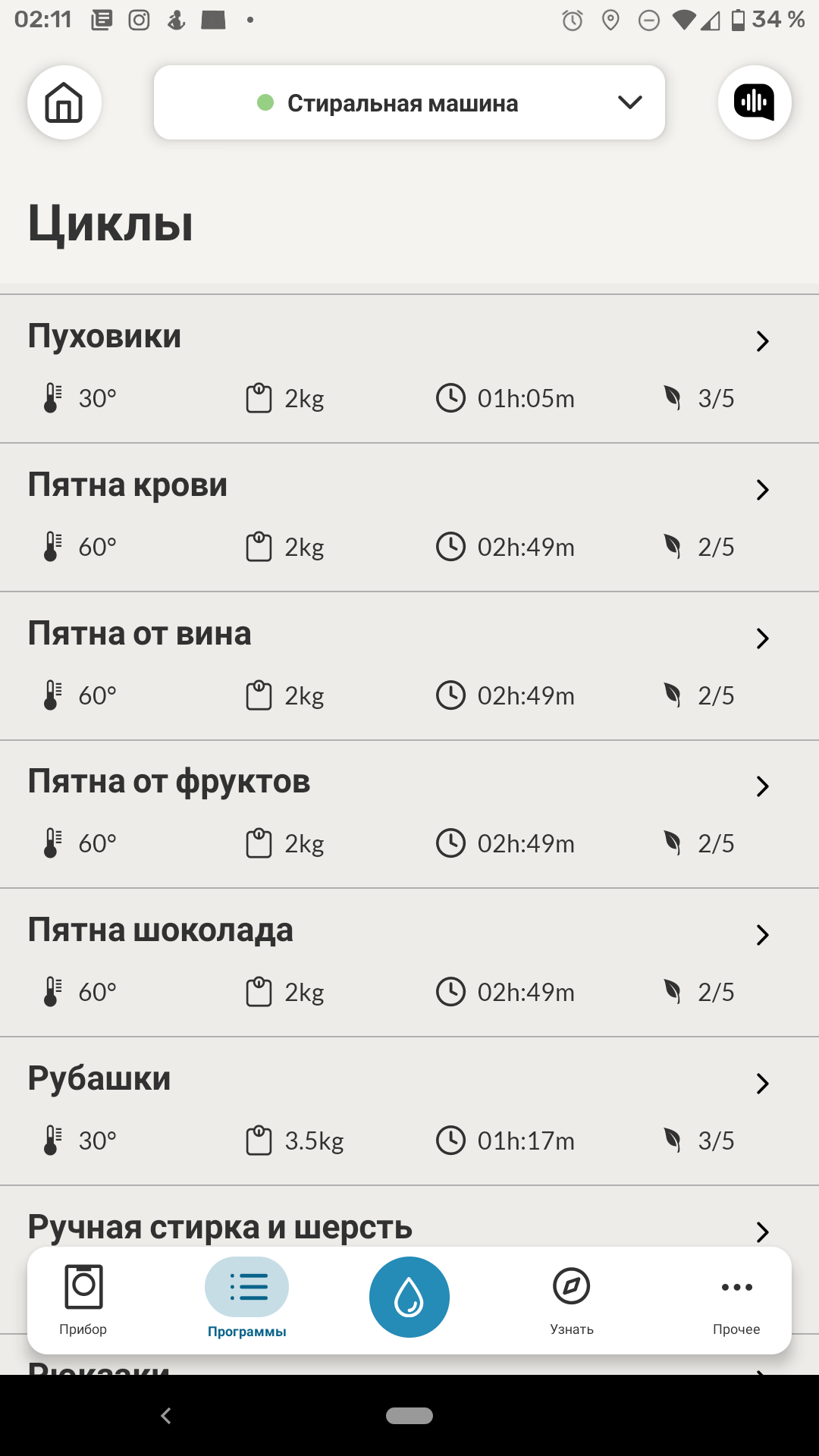 Приложение hOn впечатляет списком предустановленных программ стирки — их целых 65, на все случаи жизни. Это разнообразные режимы стирки всевозможной одежды — повседневной, спортивной, верхней и деликатной, программы удаления пятен от различных продуктов, чистки одеял и многого другого. Включены в список и актуальные для эпидемии коронавируса программы обработки медицинских масок: отдельная для стирки и отдельная — для освежения.