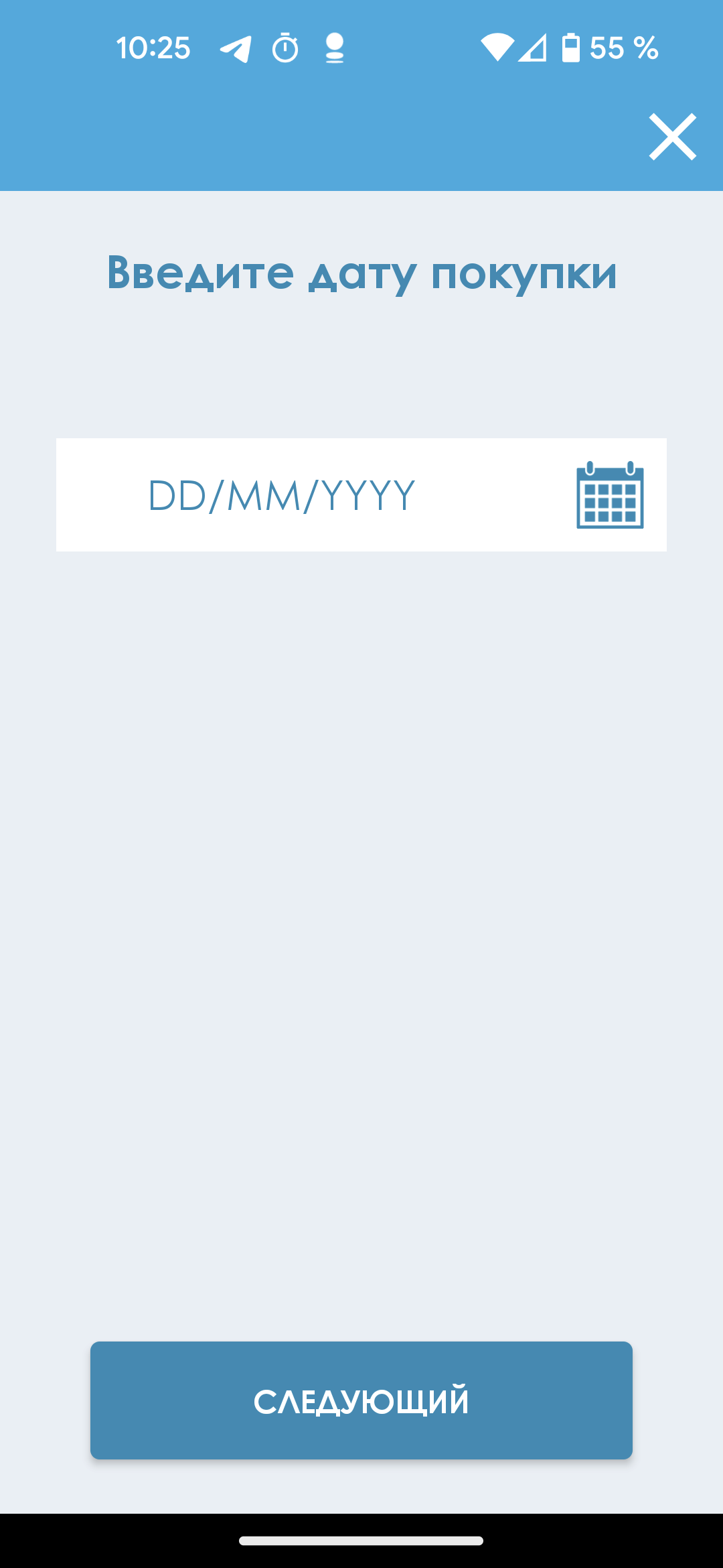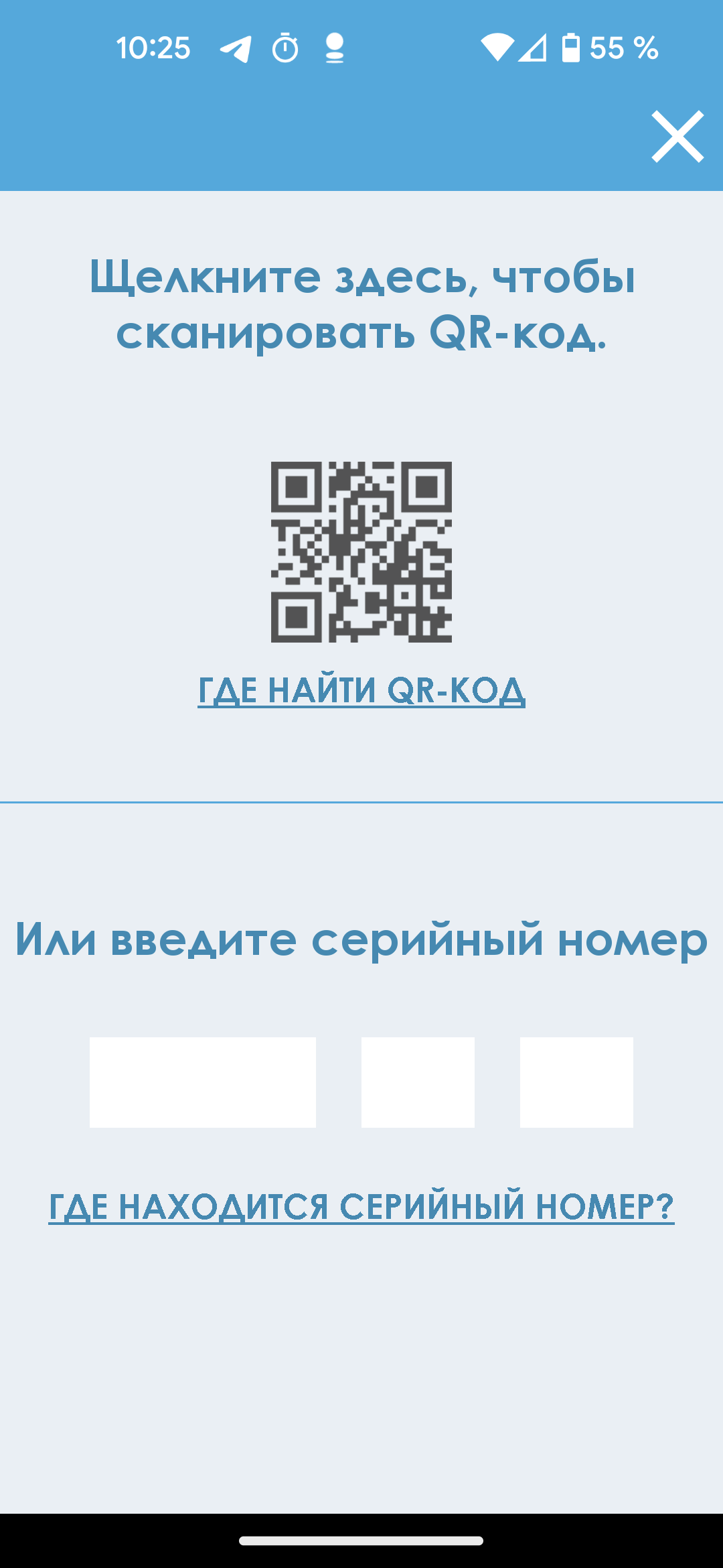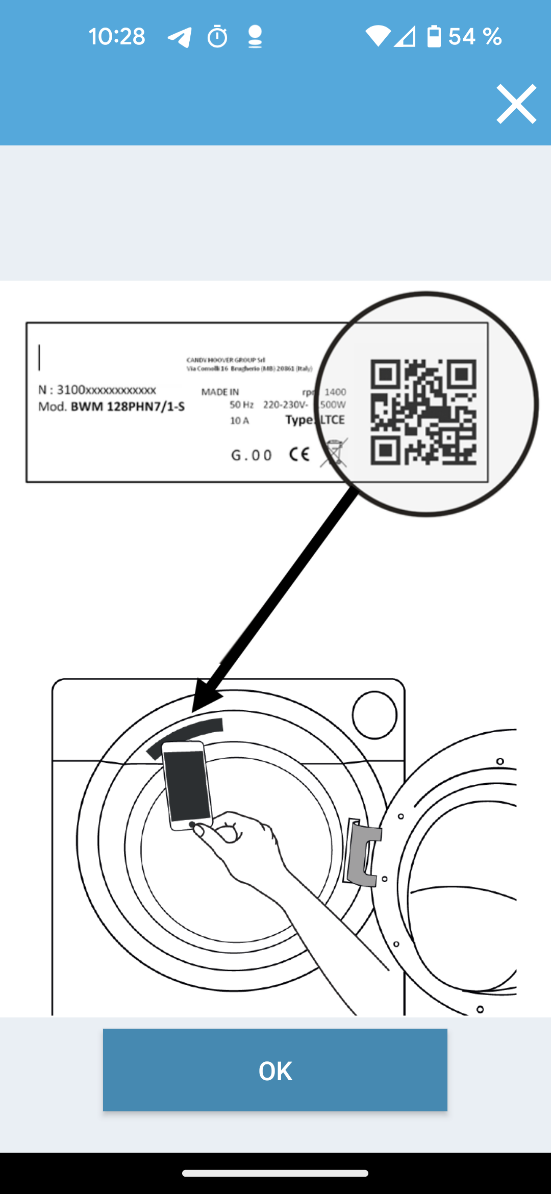Приложение запрашивает дату приобретения устройства и просит ввести серийный номер, рекомендуя поискать наклейку с QR-кодом под крышкой барабана.