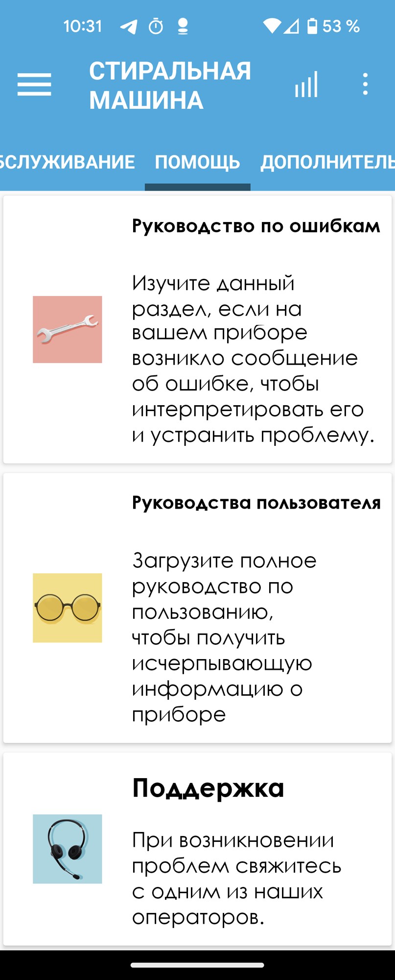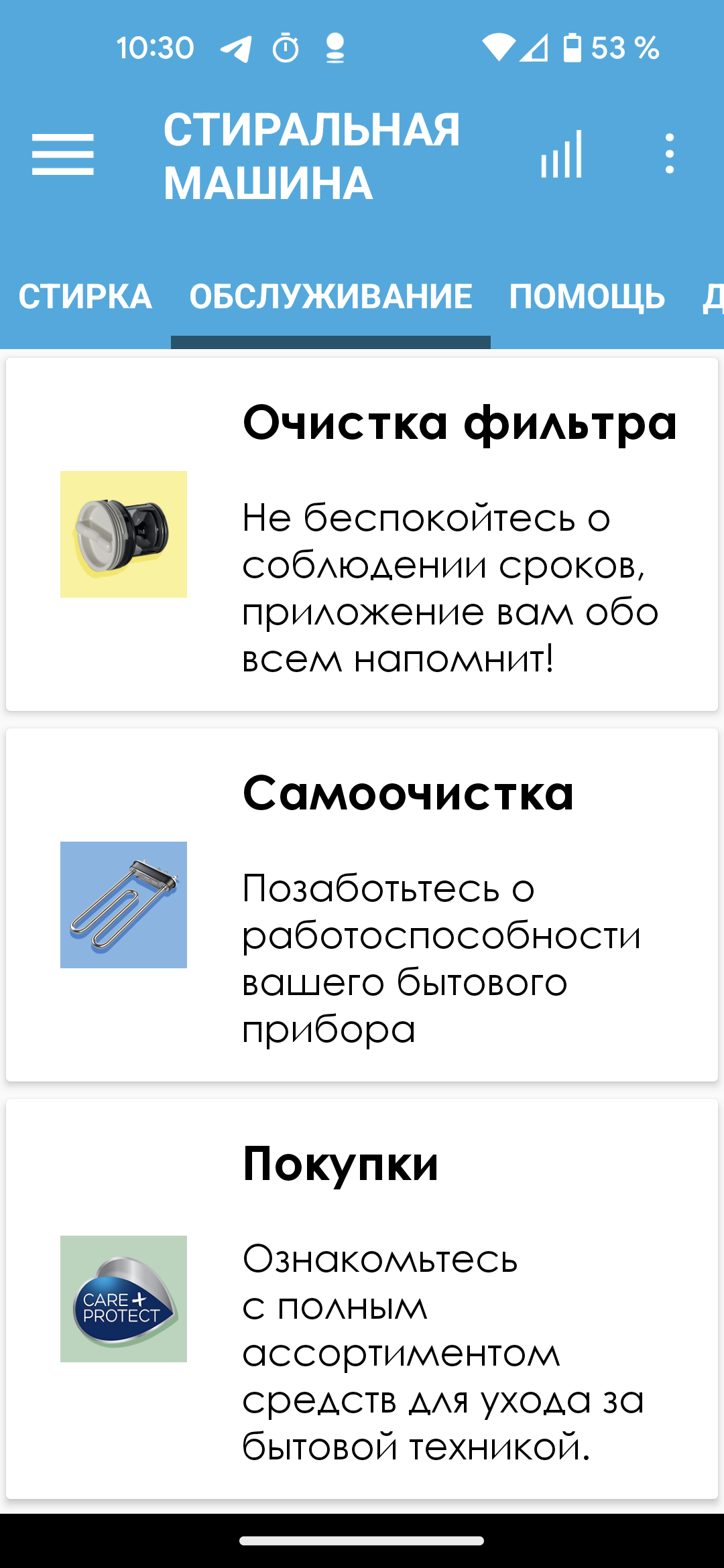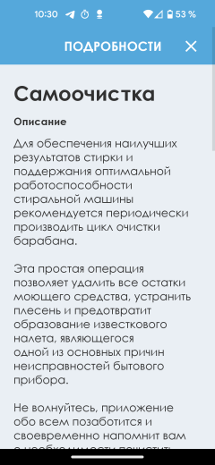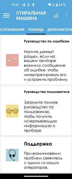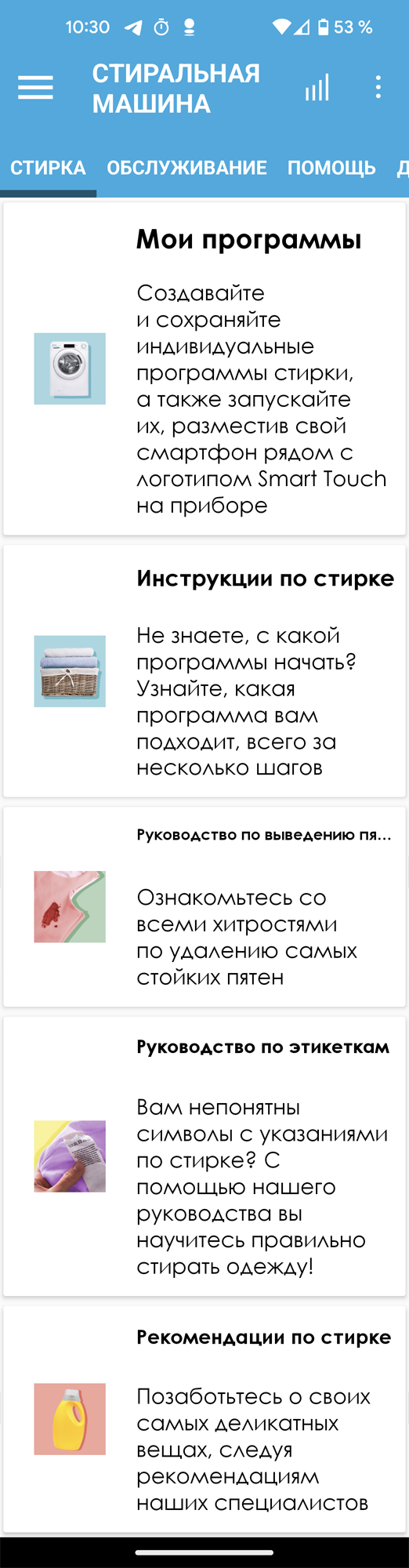 В разделе «Стирка» приложение предлагает запустить одну из встроенных в машину программ и предоставляет доступ к справочной информации: инструкции по выбору режимов, руководству по выведению пятен, сведениям о значениях символов на этикетках одежды и общим рекомендациям.