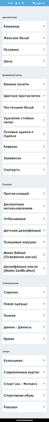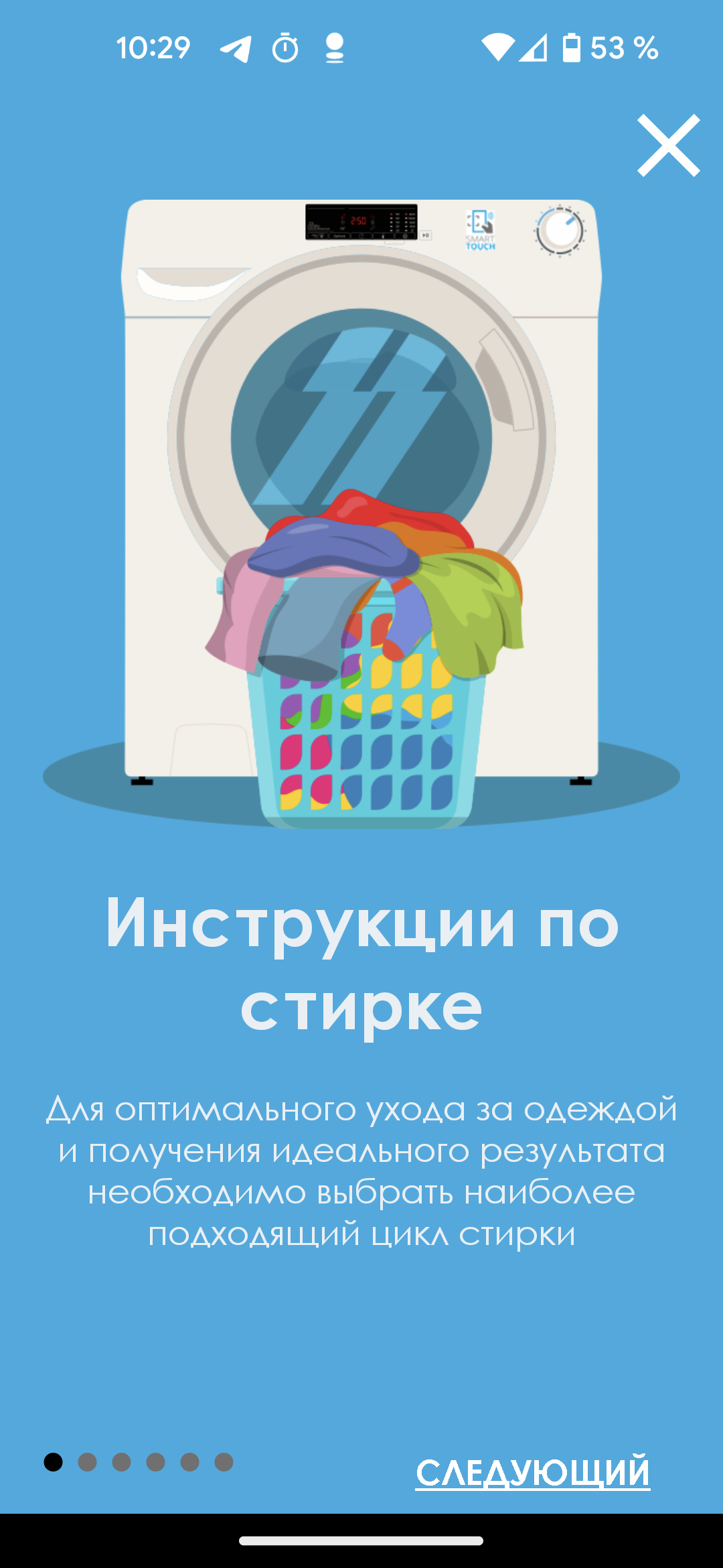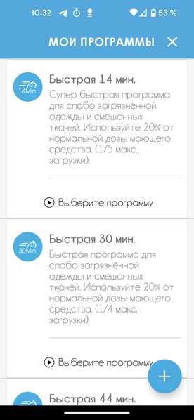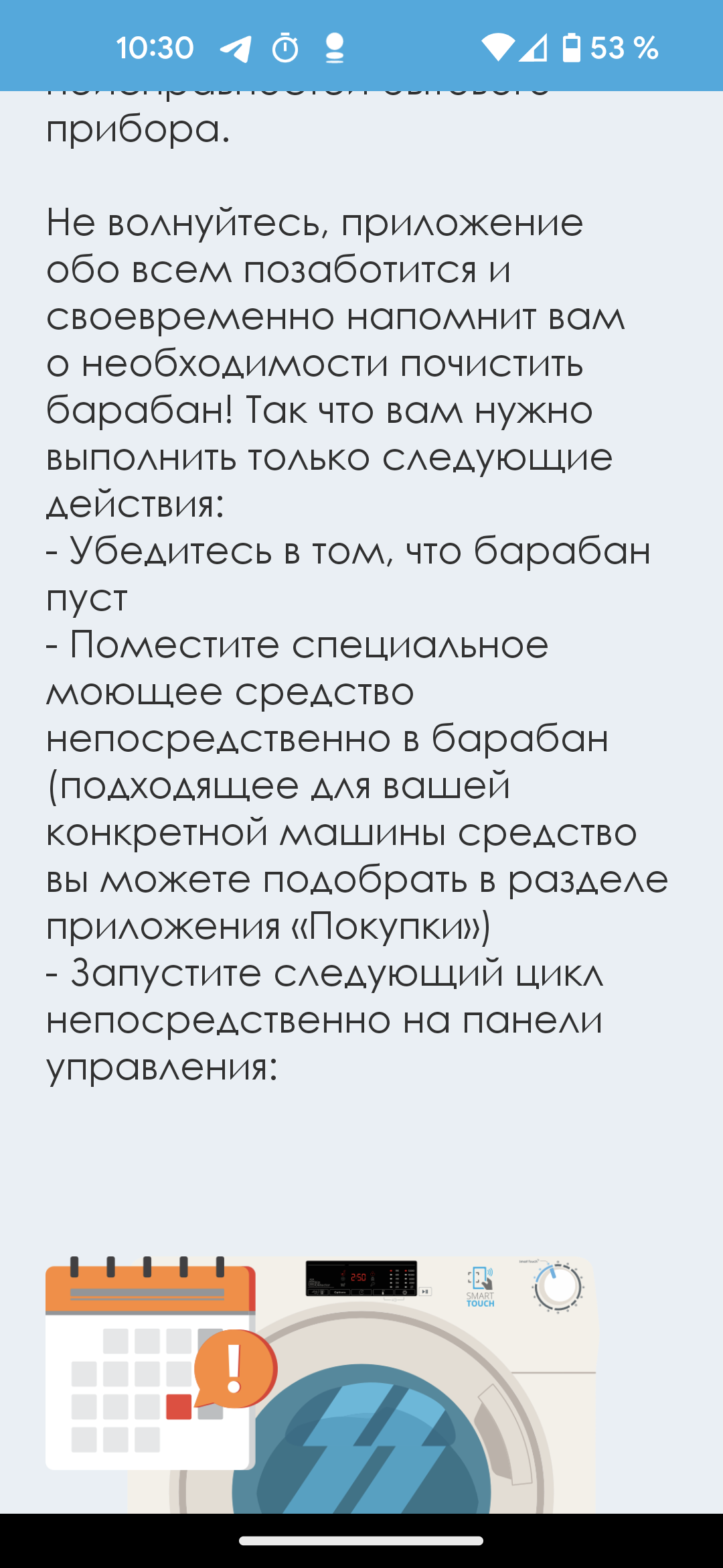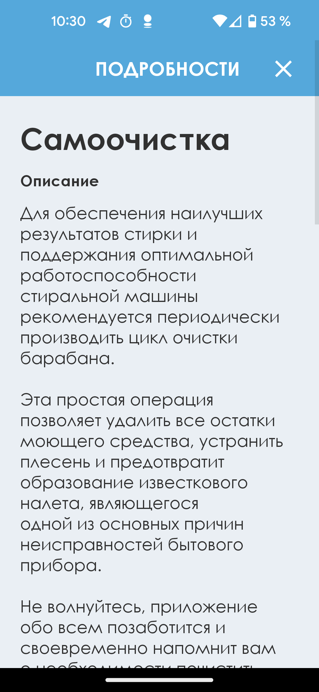 В разделе «Стирка» приложение предлагает запустить одну из встроенных в машину программ и предоставляет доступ к справочной информации: инструкции по выбору режимов, руководству по выведению пятен, сведениям о значениях символов на этикетках одежды и общим рекомендациям.
