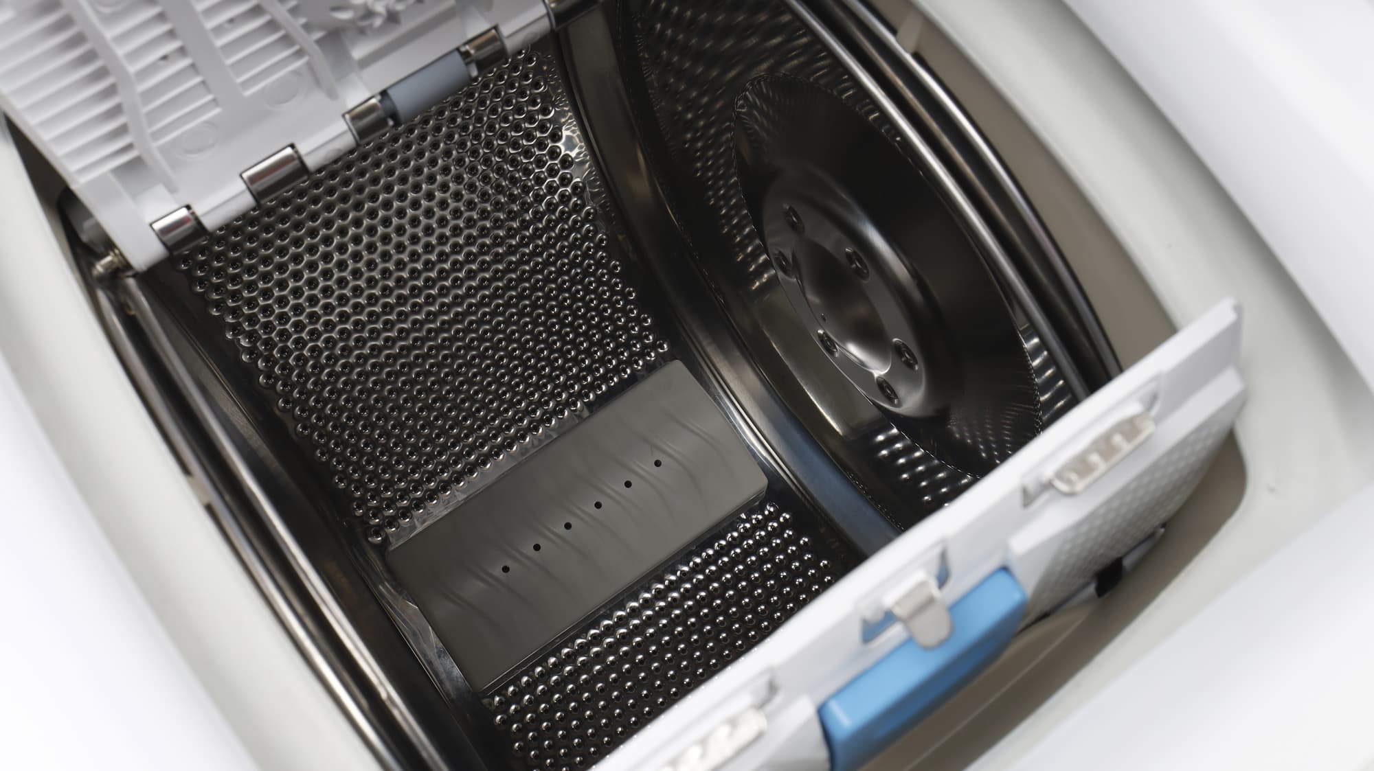Барабан машины — из нержавеющей стали. Его стенки покрыты частой равномерной перфорацией. На серых пластиковых бойниках, способствующих перемешиванию белья при стирке, также есть несколько отверстий, улучшающих гидродинамику. Каких-либо других инженерных или дизайнерских инноваций в барабане и его деталях нет.