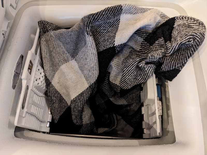 Разумеется, в стиральную машину кладут не только хлопок, но и более деликатные ткани. Например, шерсть, которую надо стирать крайне бережно. Так что мы проверили работу модели и в этом режиме, а подопытным стал плед весом чуть меньше килограмма.