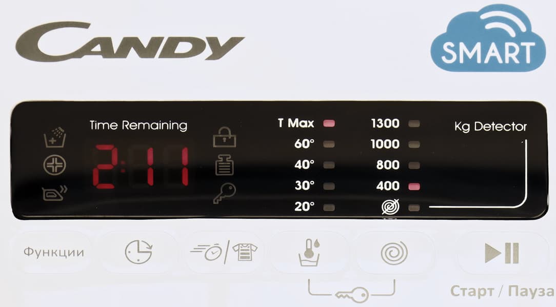 Выбор программ осуществляется вращения селектора в правой части панели. У Candy Smart CST G283DM/1-07 солидный набор режимов с возможностью ручной регулировки в широких пределах температуры воды и скорости отжима. В таблице ниже мы приводим значения по умолчанию для каждой из программ и возможный диапазон ручных настроек.
