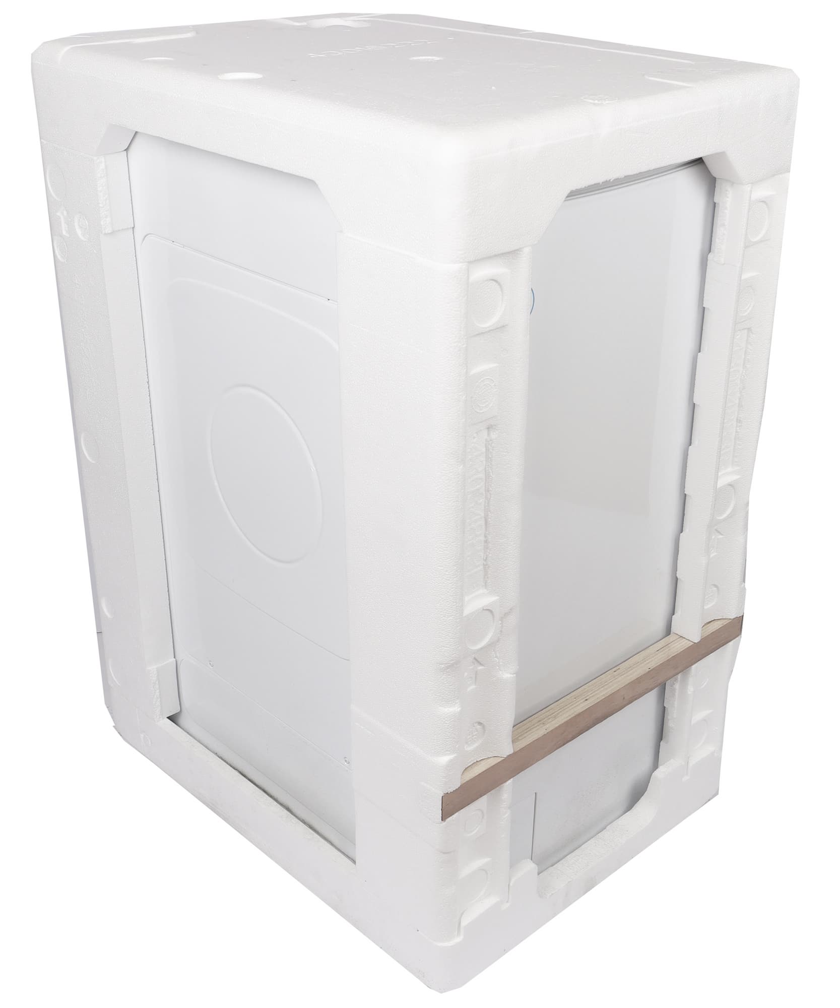 Стиральная машина поставляется в пенопластовой технологической упаковке, которая усилена деревянными распорками и обтянута полиэтиленовой пленкой. Краткая сопроводительная информация (индекс модели, отметки завода-изготовителя, серийный номер и транспортировочные инструкции) размещена на наклейках поверх полиэтилена.