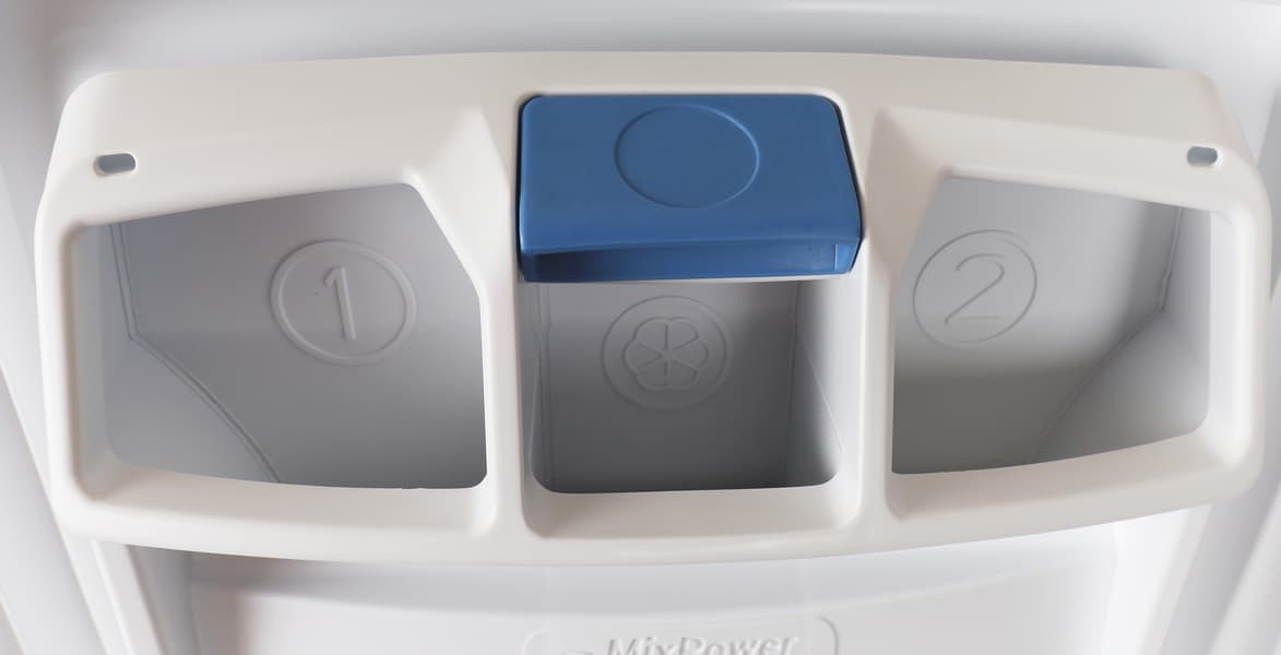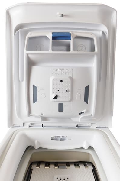 Загрузка моющих средств в машину показалась непривычной: чаще всего два больших отсека в соответствующем контейнере используются для основной и предварительной стирки. При дополнительном изучении инструкции мы выяснили, что в этой модели левый отсек предназначен для стирального порошка, а правый — для жидких моющих средств. При необходимости предварительной стирки порошок или гель следует добавлять прямо в барабан.