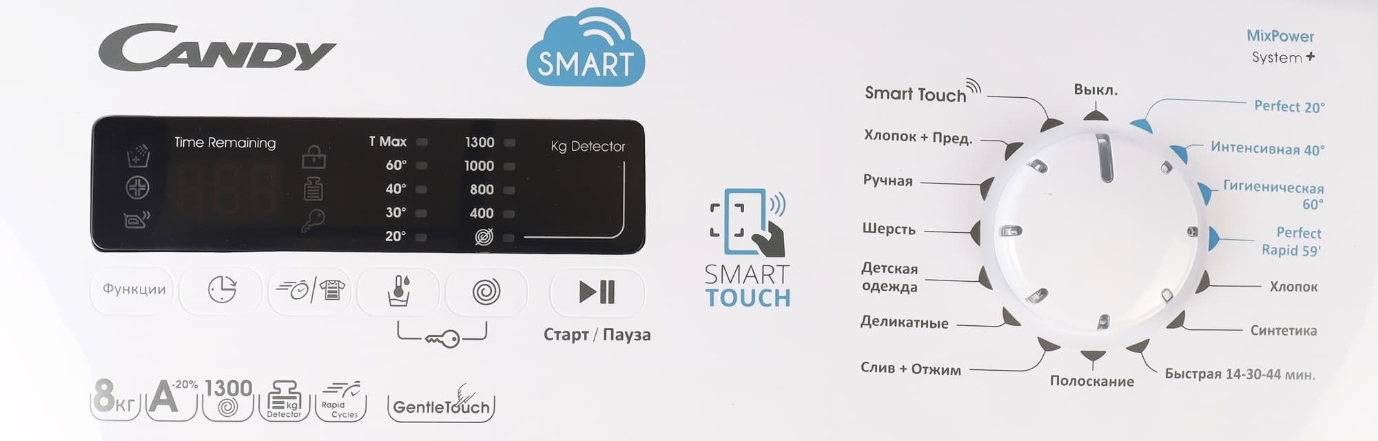В левой части панели управления расположен дисплей с красными светодиодными индикаторами и сенсорными кнопками дополнительных функций, в правой — круглый селектор программ. Между ними — логотип «Smart Touch», под которым скрывается антенна NFC-модуля.