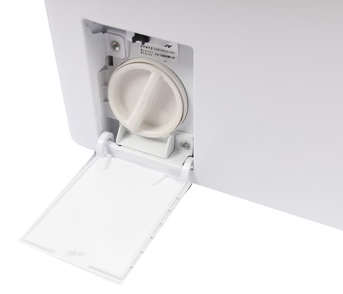 В нижнем правом углу передней панели расположен лючок фильтра. Он открывается с некоторым трудом: при необходимости доступа к пробке лучше воспользоваться лезвием ножа или плоской отверткой. Под крышкой — наклейка с индексом модели и серийным номером изделия.