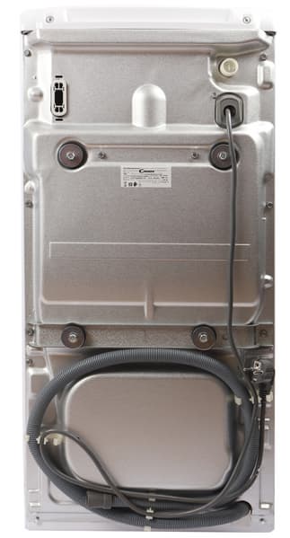 В верхней части металлической задней панели мы видим розетку для подключения заливного шланга, снабженную пластиковой сеткой, которая защищает машину от возможных загрязнений и ржавчины из водопровода. Сливной шланг уже установлен — он выходит из нижнего правого угла.