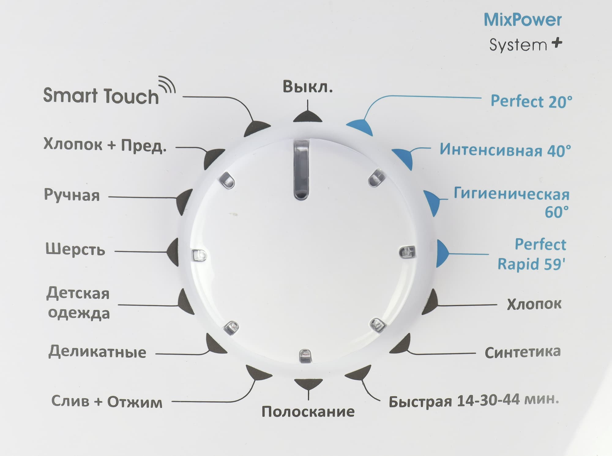Управление не вызвало у нас затруднений, оно интуитивно понятно и не требует подглядывания в инструкцию. Однако кое-что показалось недостаточно удобным и логичным — расположение режимов стирки на селекторе. Как нам кажется, стоило бы разместить самые востребованные программы ближе к исходному положению селектора.
