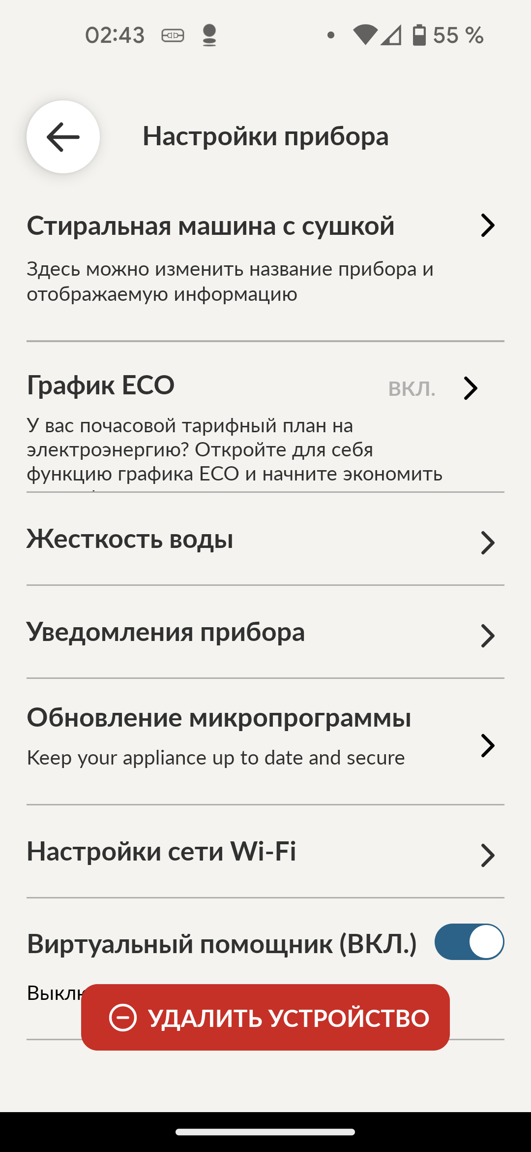 В разделе настроек есть возможность установить уровень жесткости воды, провести обслуживание и самодиагностику стиральной машины, а также управлять уведомлениями и кое-какими сервисными функциями приложения.
