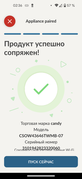 Для синхронизации машины необходимо просканировать QR-код, расположенный на наклейке с серийным номером под люком барабана. Приложение подсказывает, где его искать, и запрашивает разрешение на доступ к камере.