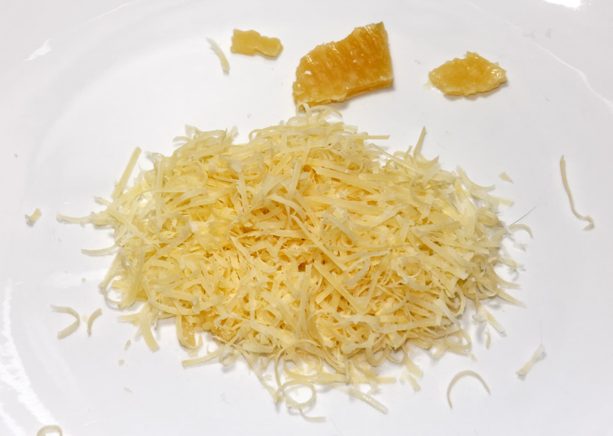 Твердый сыр (пармезан) мы натерли на самой мелкой терке. Результат оказался отличным как в том, что касается измельчения продукта, так и по незначительному количеству отходов (всего несколько кусочков, которые можно увидеть на фото).