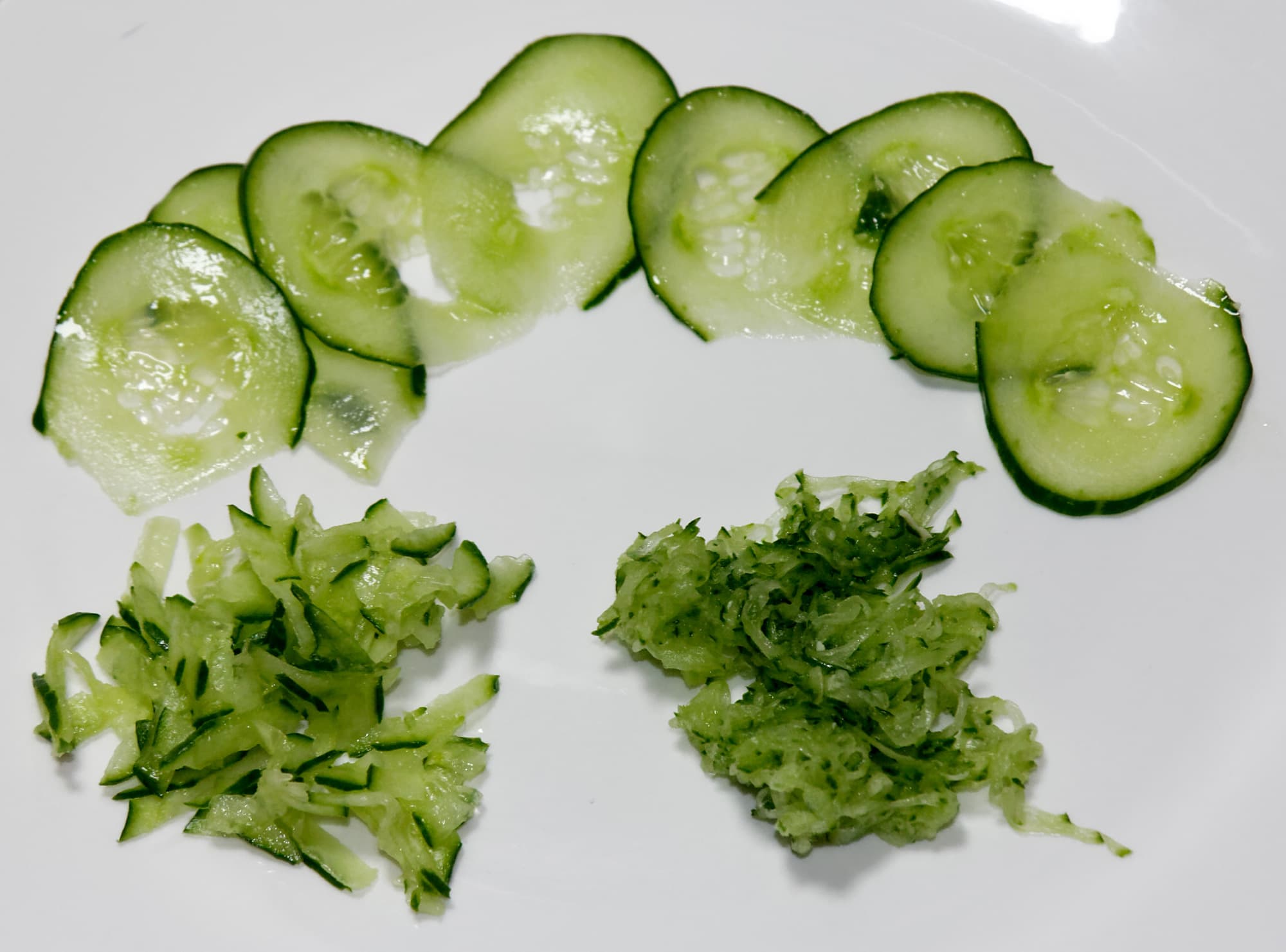 Огурцы оказались аккуратно нарезаны и потерты, без особых потерь (как в виде сока, так и в виде частиц кожуры).