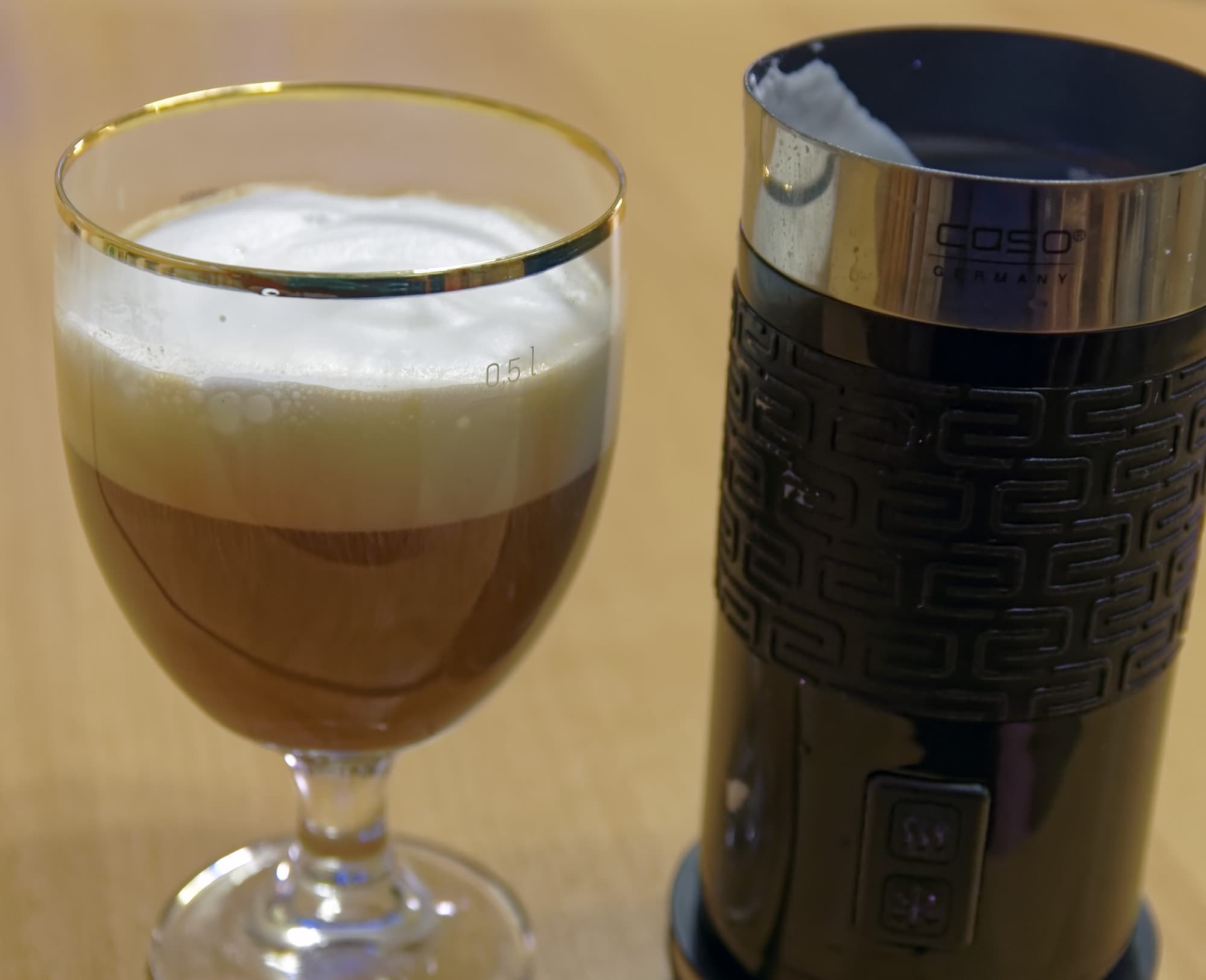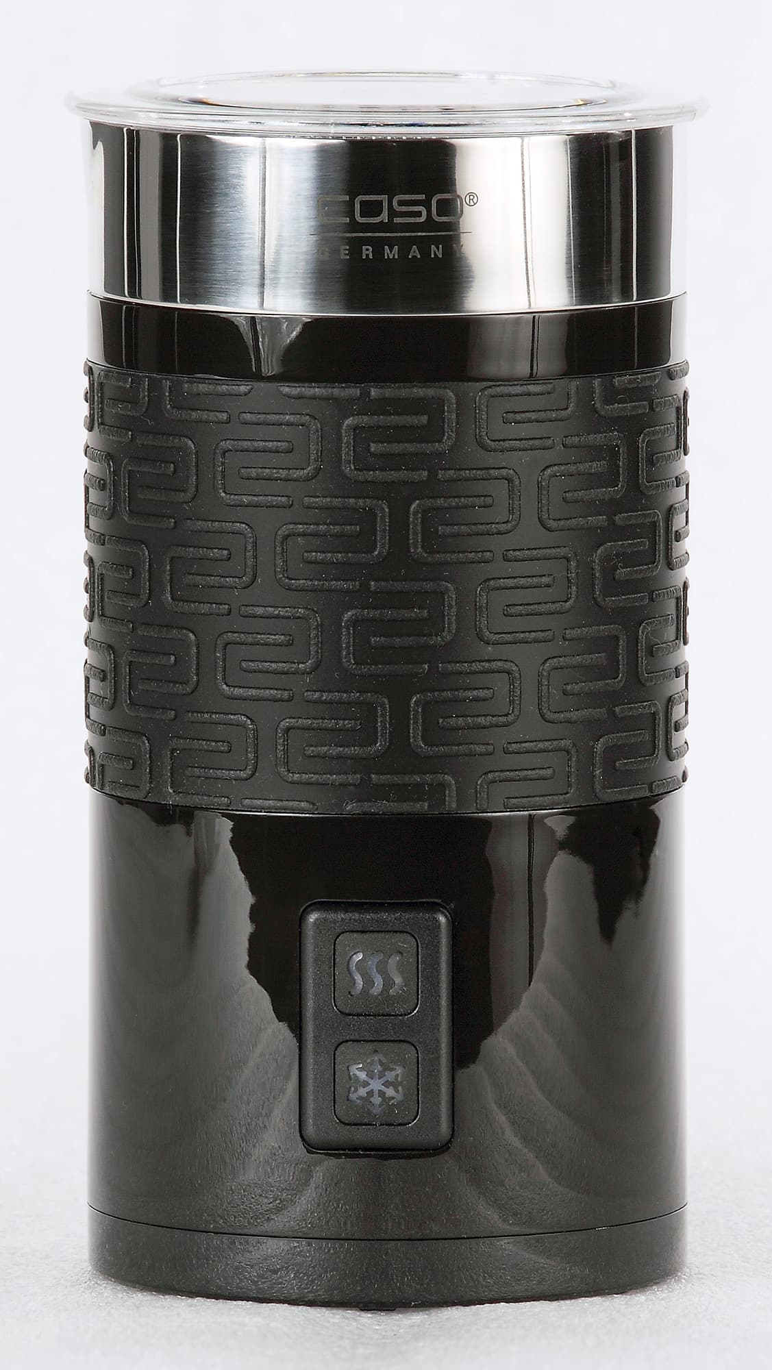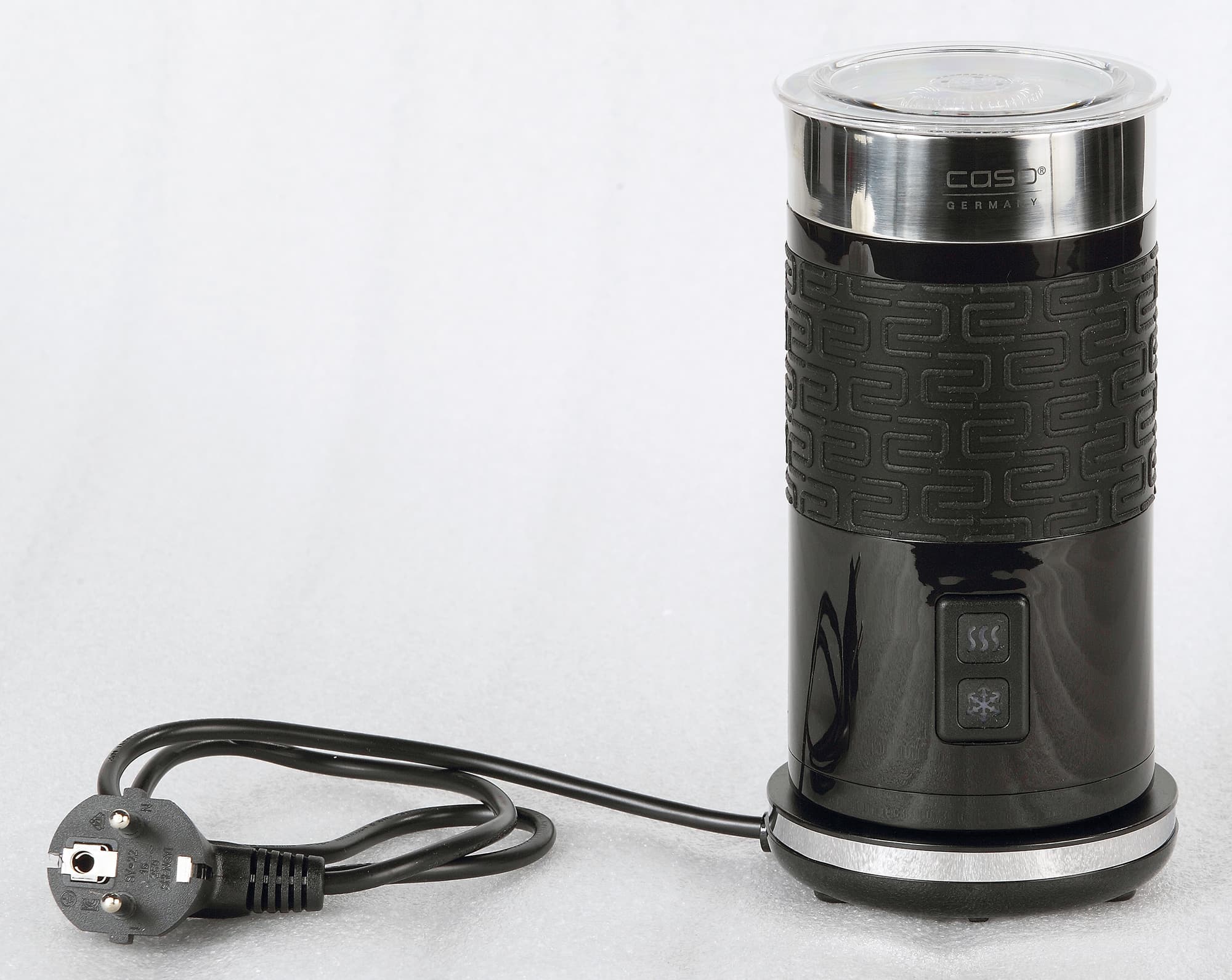 В наших обзорах различных приборов для приготовления кофе мы неоднократно упоминали капучинаторы. И вот теперь в нашей лаборатории оказался прибор, который делает молочную пену. Пеновзбиватель Caso представляет собой стакан с венчиками и крышкой, установленный на базу. Прибор умеет подогревать молоко, делать холодную и горячую молочную пену.