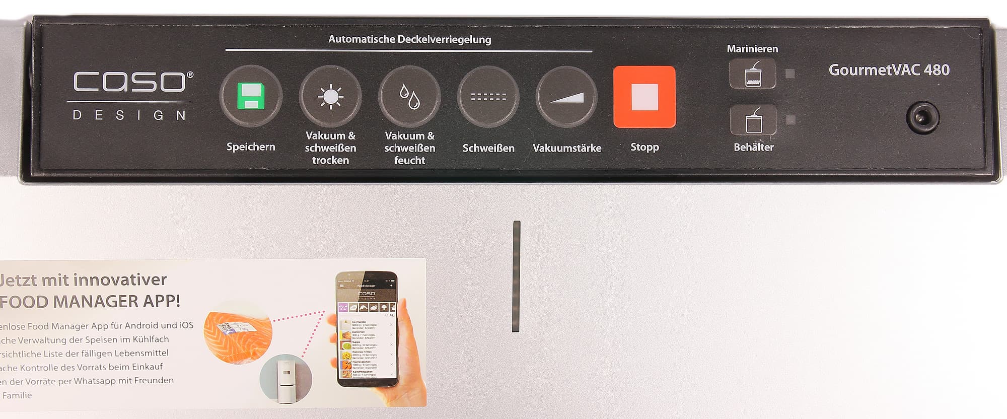 Визуально вакууматор Caso GourmetVac 480 производит впечатление серьезного и довольно крупного прибора, который более уместно смотрелся бы на кухне кафе или ресторана, а не в обычной квартире. Причин тому несколько: это и угловатый дизайн с прямыми углами, и строгий металлический цвет корпуса, и наличие отсека для хранения рулона упаковочной пленки. Однако, обо всем по порядку. Давайте взглянем на упаковщик повнимательнее.