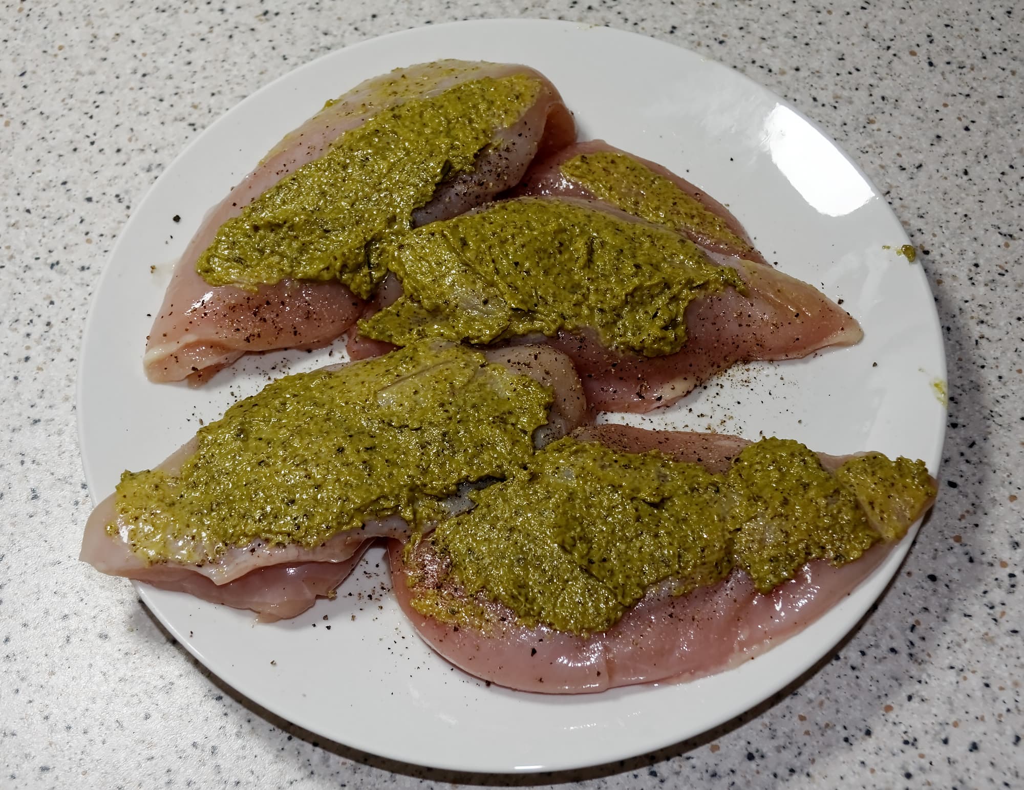 Для этого теста мы взяли филе куриной грудки, посолили его, обильно смазали соусом песто и вакуумировали.