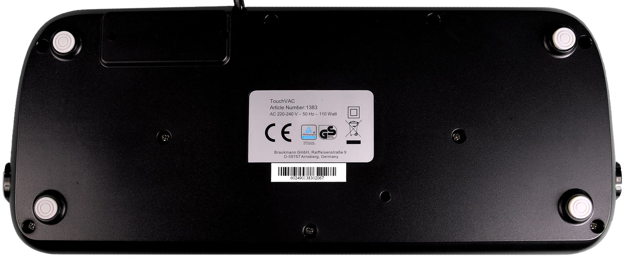 Корпус вакууматора выполнен из черного глянцевого пластика высокого качества. Снизу можно увидеть резиновые ножки, препятствующие скольжению. По бокам расположены подпружиненные кнопки, фиксирующие крышку устройства.