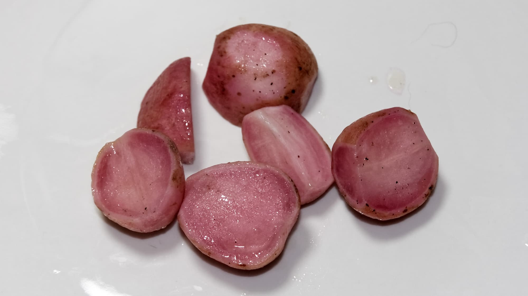 Необычная консистенция «размягченного» редиса вместе с маслом и солью создает довольно оригинальный вкус. К тому же редис окрашивается в розовый цвет в процессе приготовления, в результате чего на тарелке он выглядит симпатично и аппетитно.